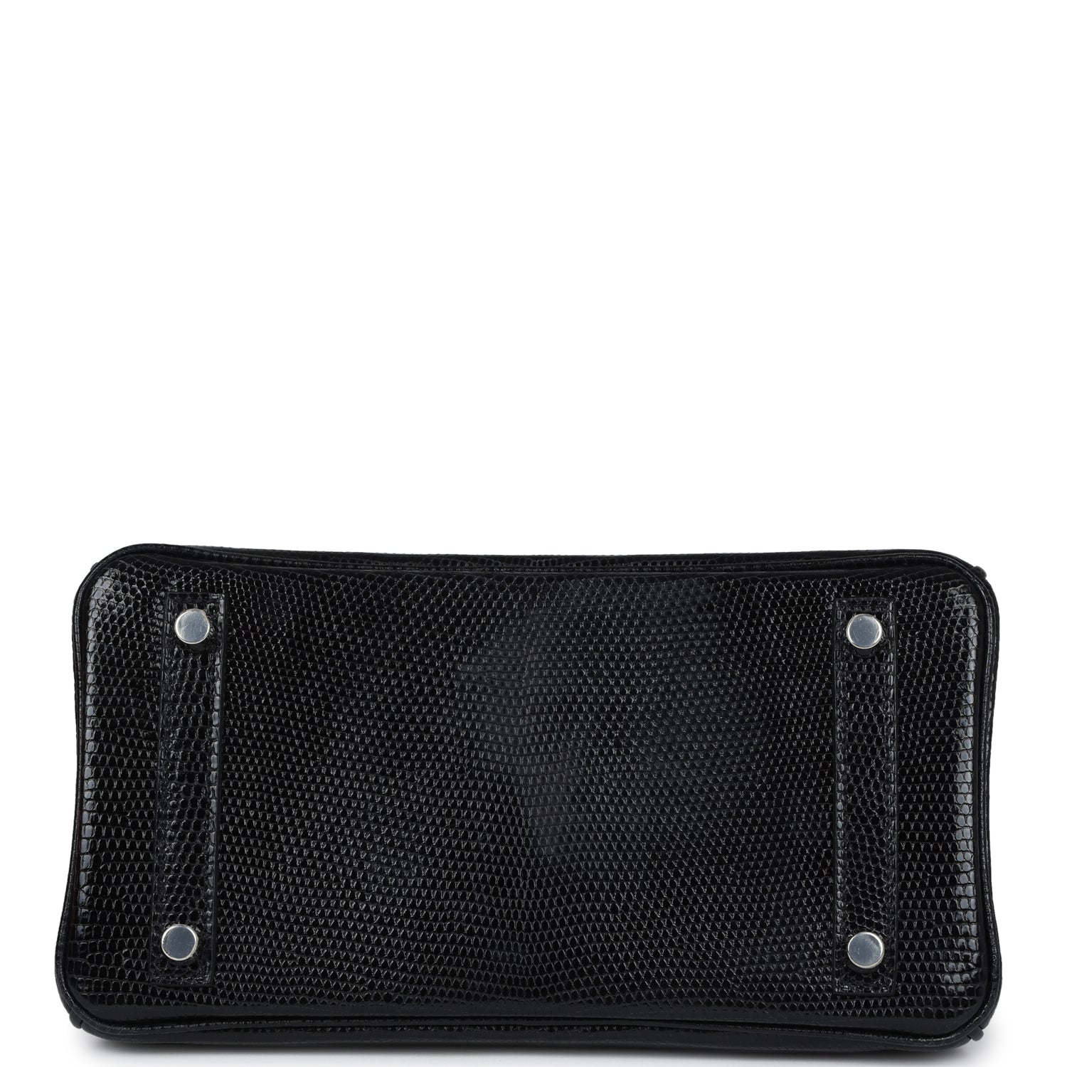 This Birkin is inBlack shiny Varanus Niloticus lizard leatherwith palladium hardware and has tonal stitching,front flap, two straps withcentertoggle closure, clochette with lock and two keys, and double rolled handles.