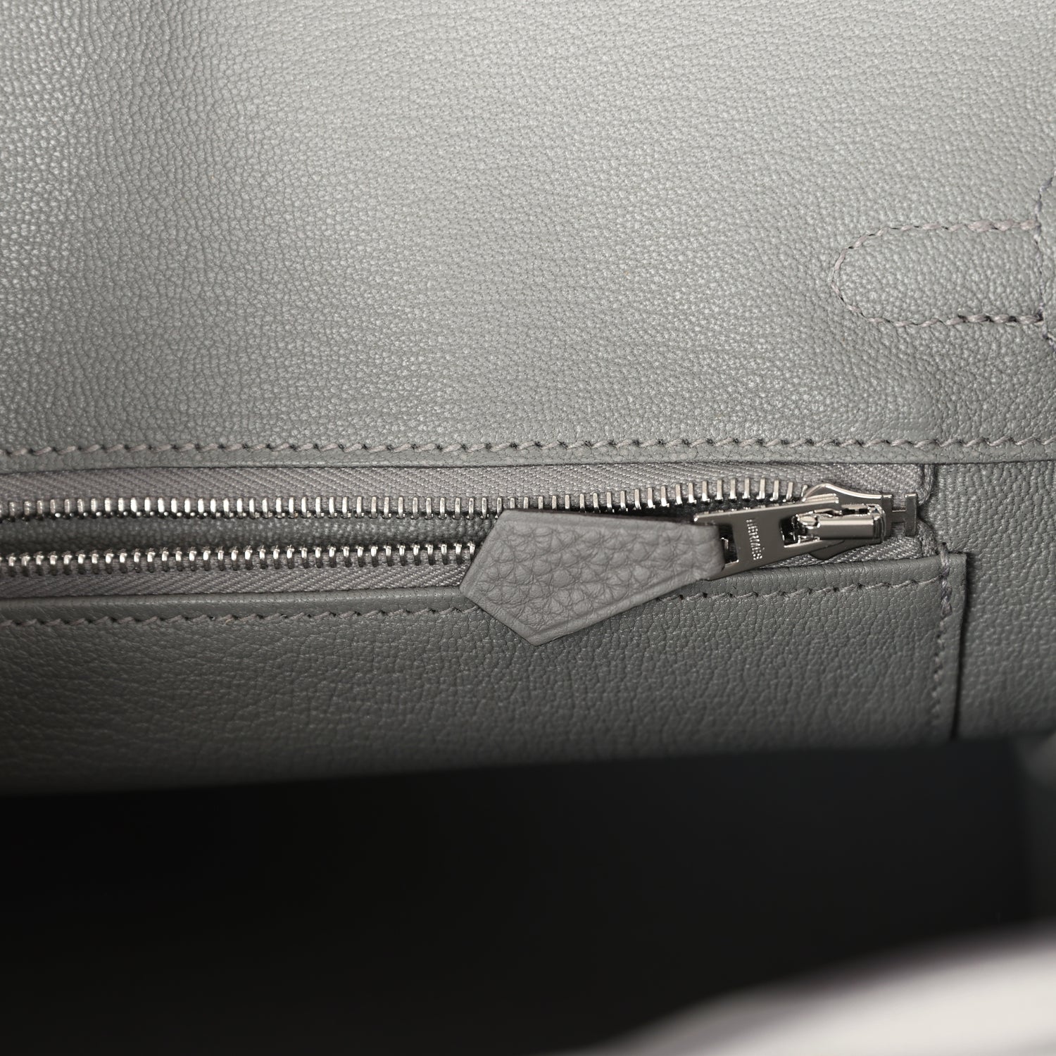 The interior is lined with Gris Meyer chevre and has a zip pocket with an Hermès engraved zipper pull and an open pocket on the opposite side.