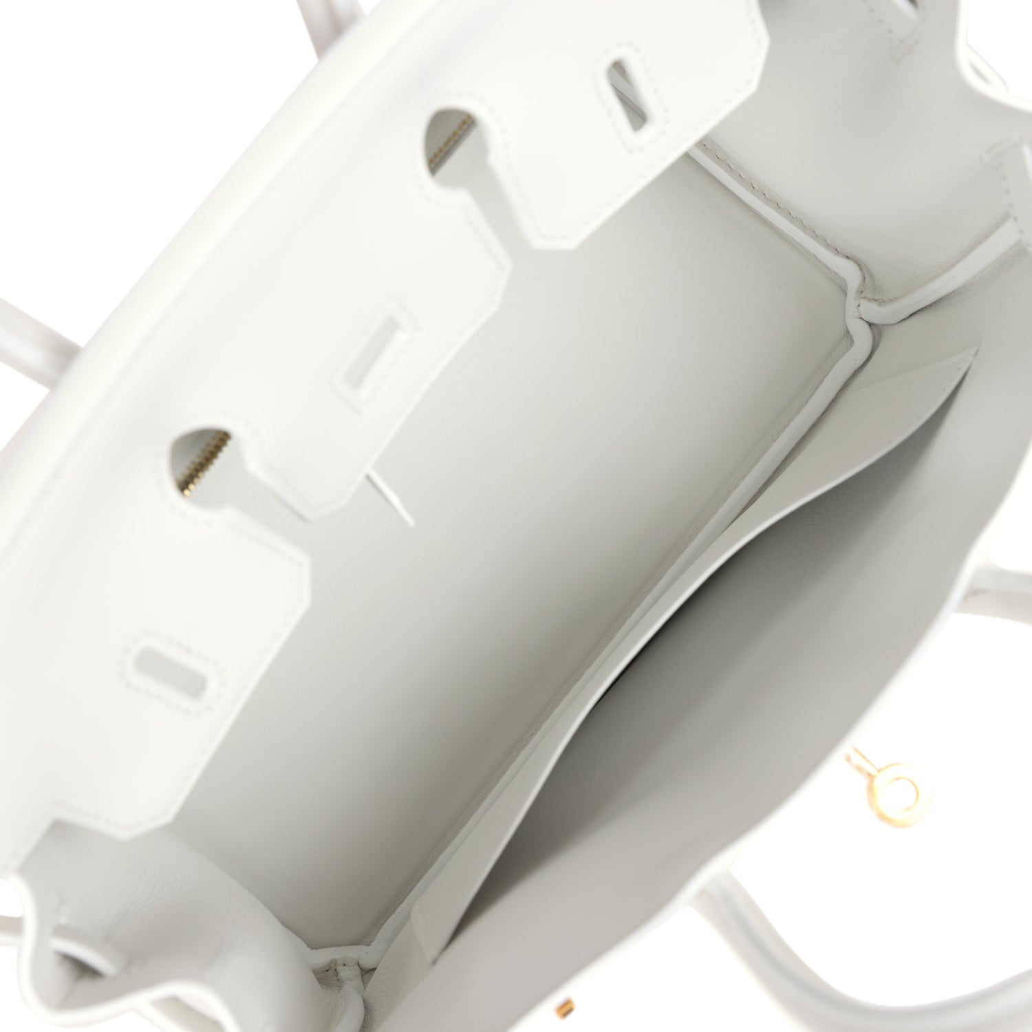 The interior is lined with New White Swift leather and has one zip pocket with an Hermès engraved zipper pull and an open pocket on the opposite side.