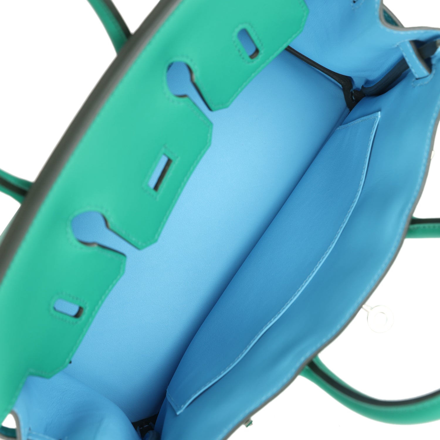 The interior is lined with Bleu Celeste swift and has one zip pocket with an Hermès engraved zipper pull and an open pocket on the opposite side.