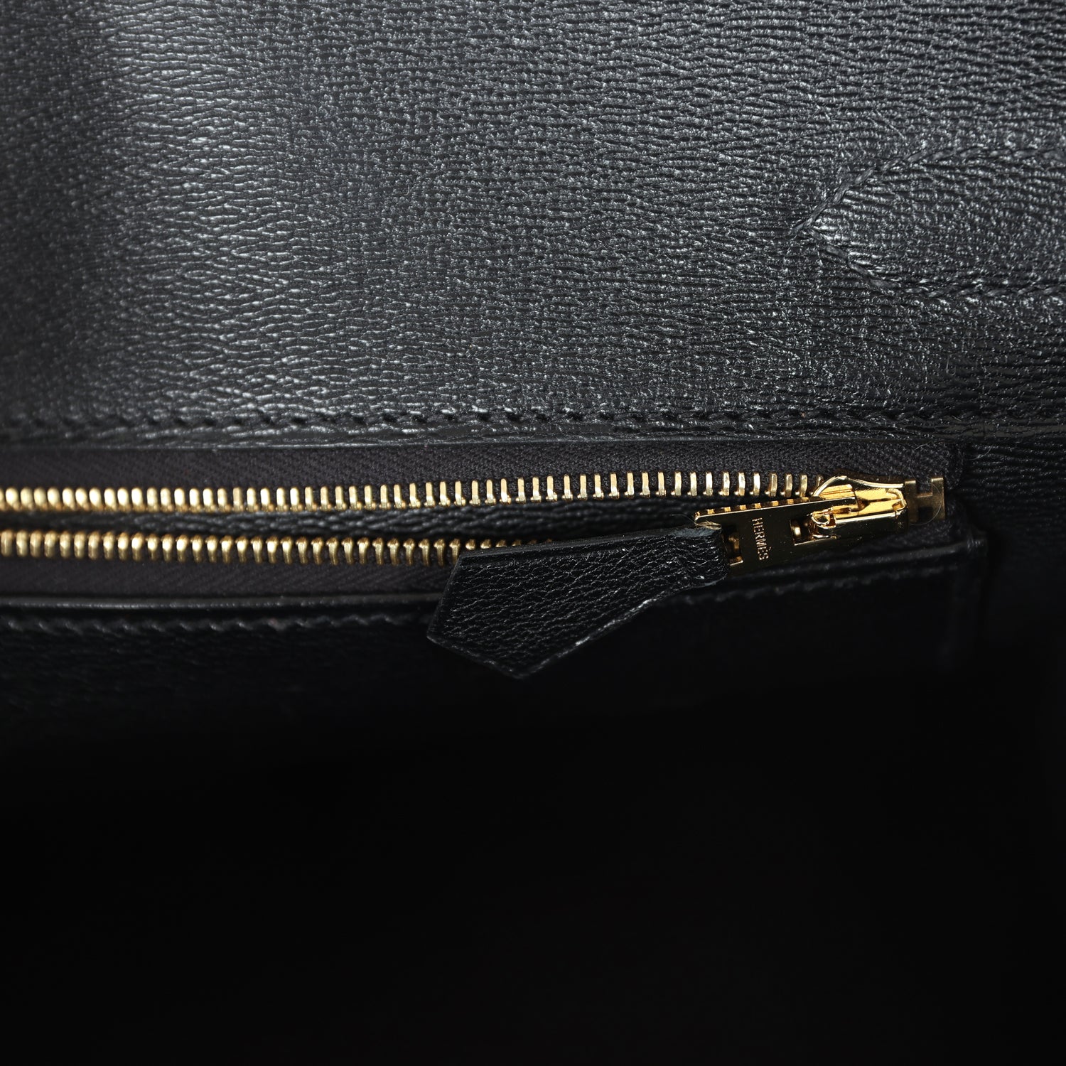 The interior is lined with black chevre and has one zip pocket with an Hermès engraved zipper pull and an open pocket on the opposite side.