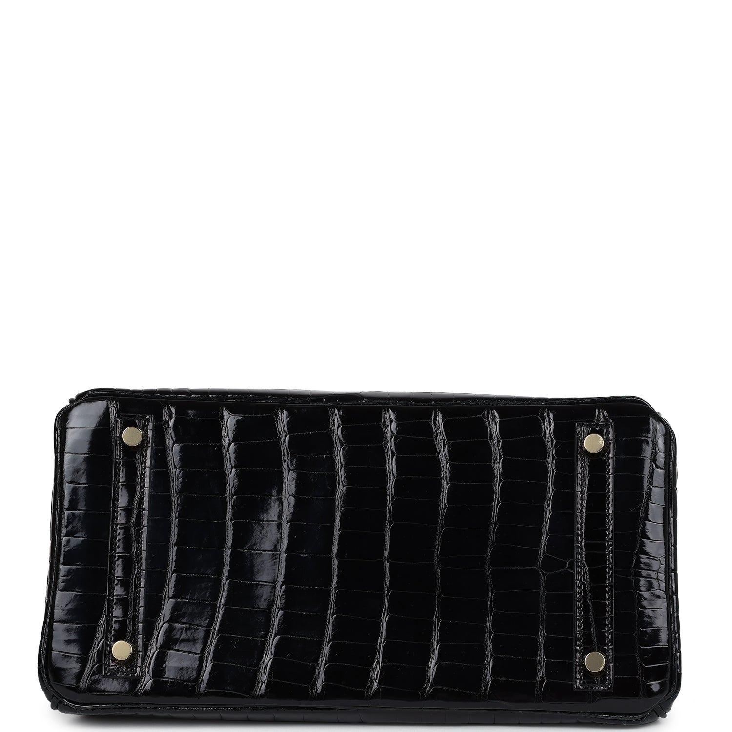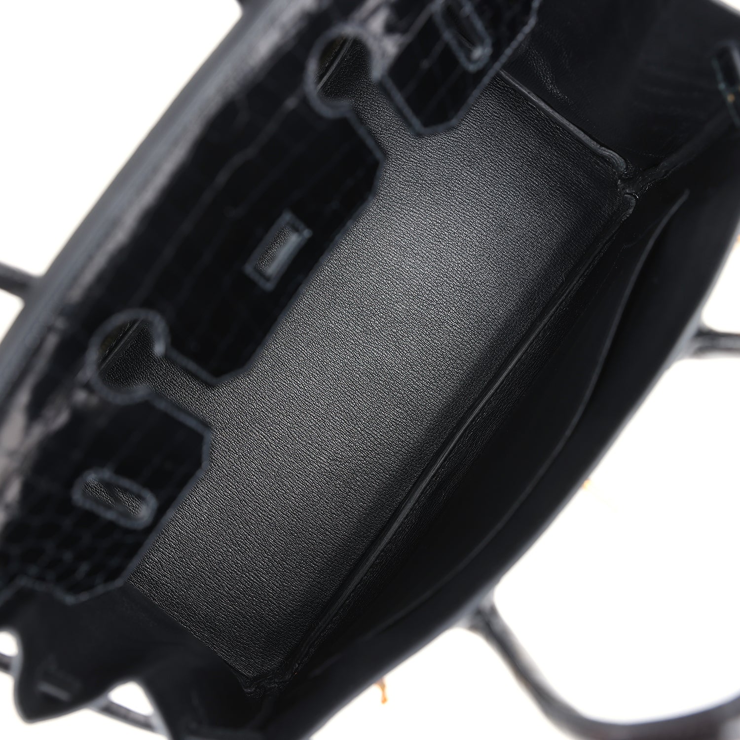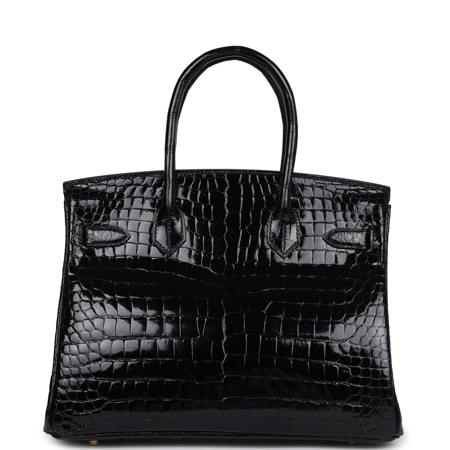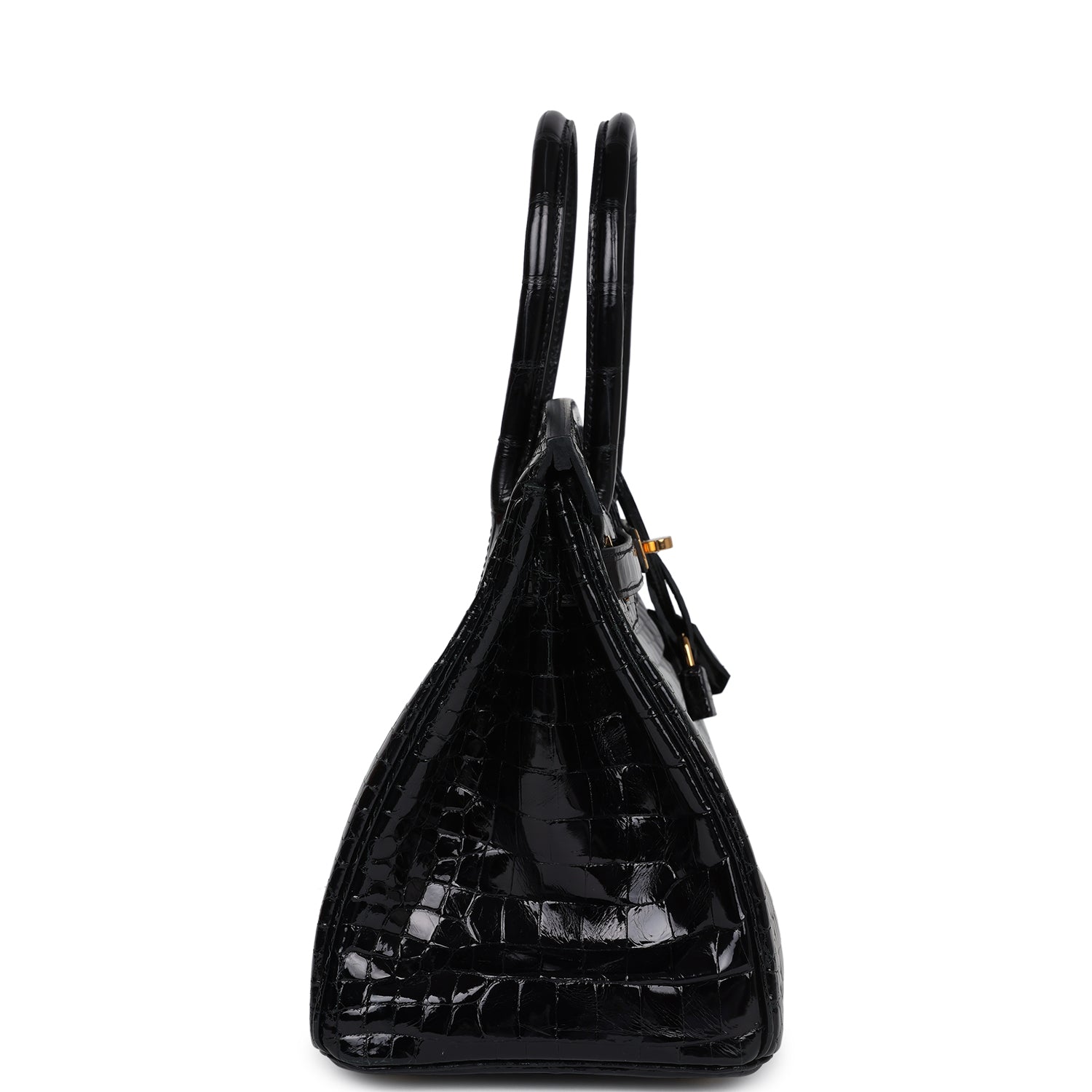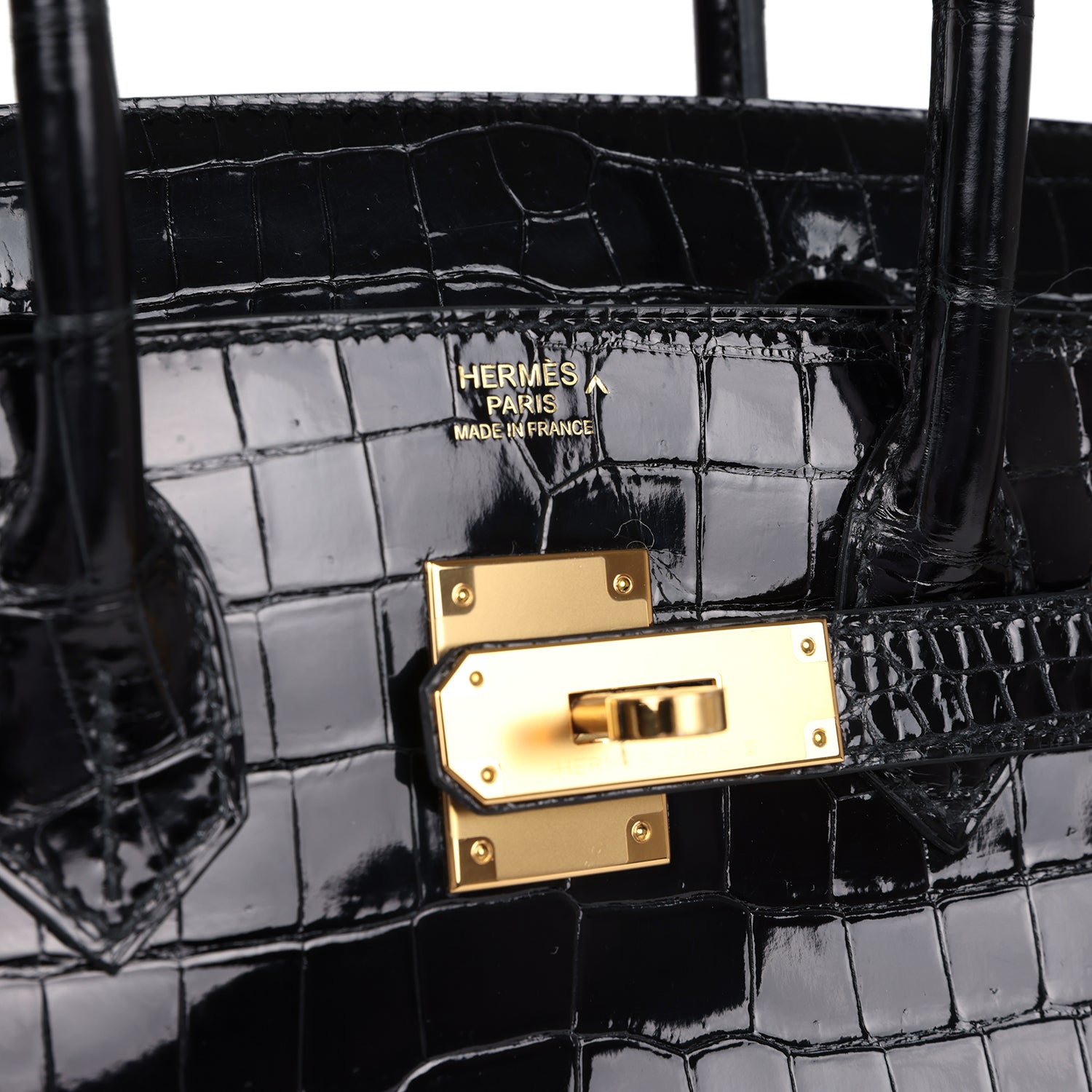 This Birkin is in Black shiny porosus crocodile with gold hardware and has tonal stitching,front flap, two straps withcentertoggle closure, clochette with lock and two keys, and double rolled handles.