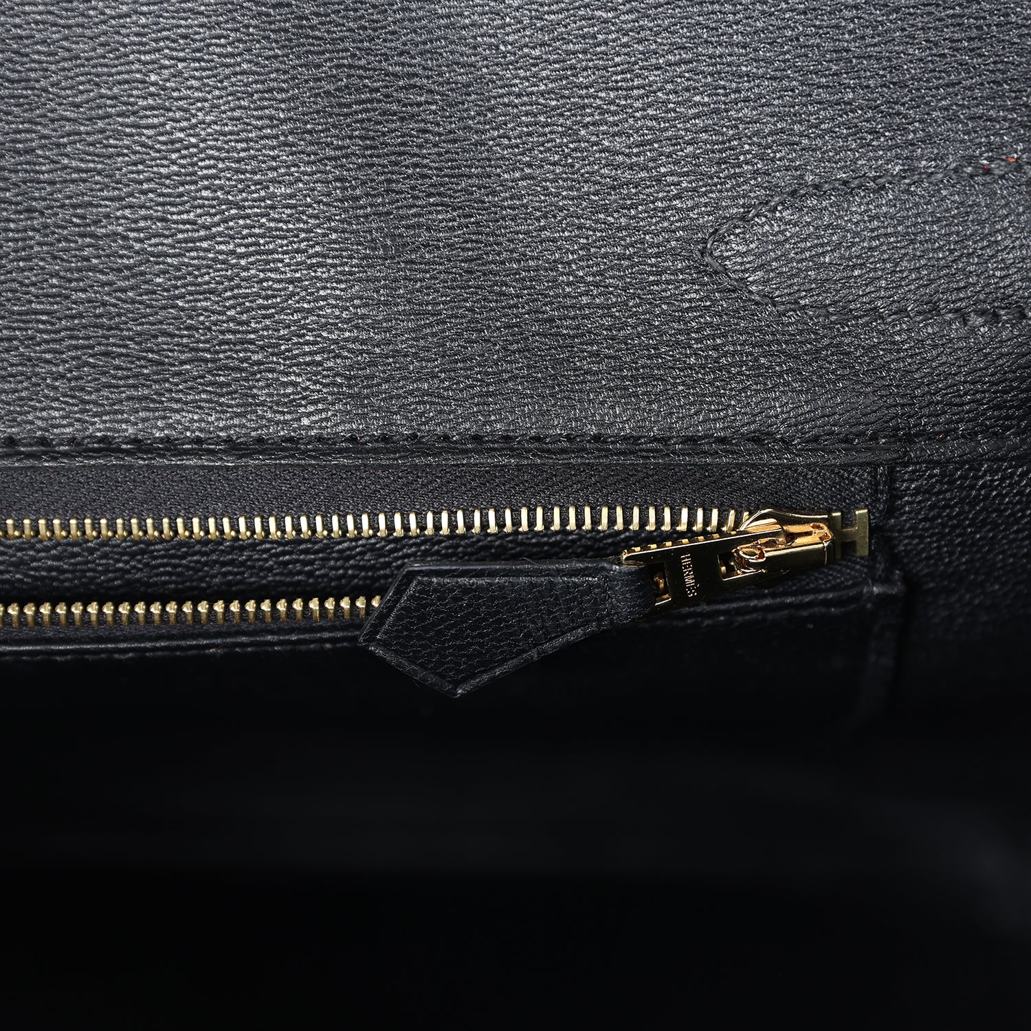 The interior is lined with Black chevre and has one zip pocket with an Hermès engraved zipper pull and an open pocket on the opposite side.