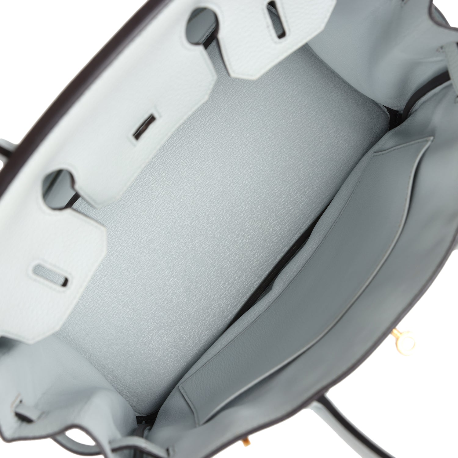 The interior is lined with Bleu Pale chevre and has one zip pocket with an Hermès engraved zipper pull and an open pocket on the opposite side.