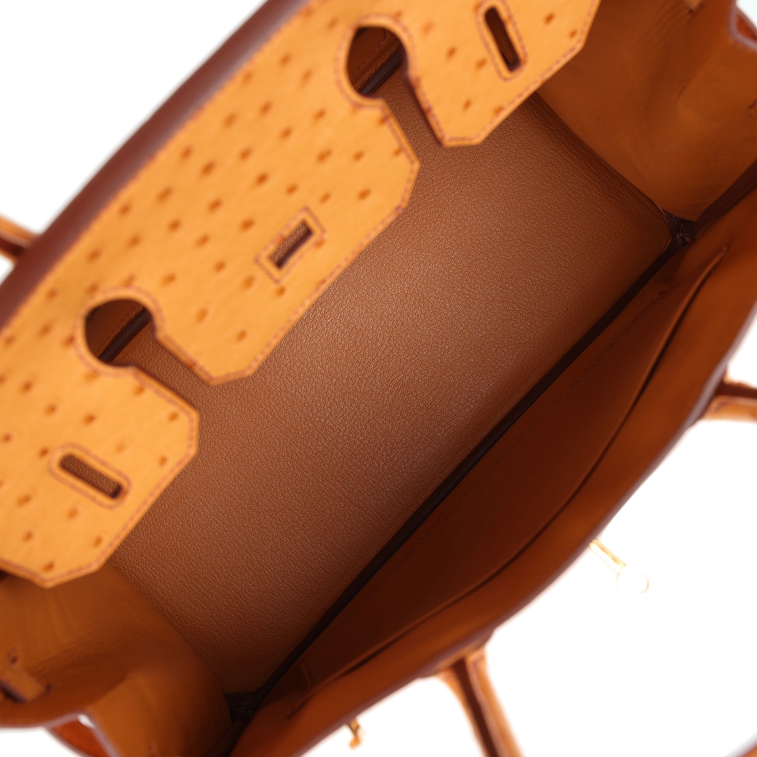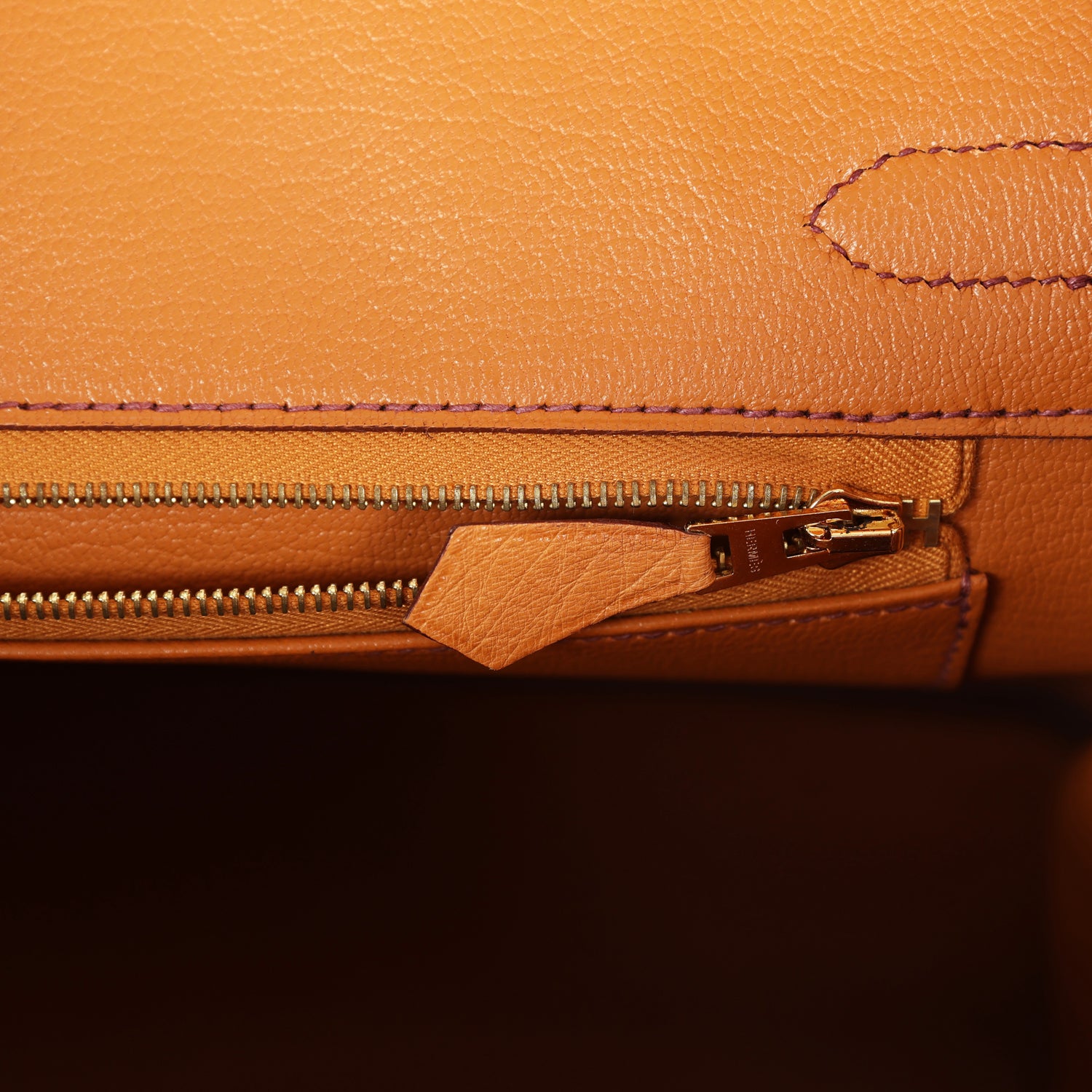 The interior is lined withgold chevre and has a zip pocket with an Hermès engraved zipper pull and an open pocket on the opposite side.