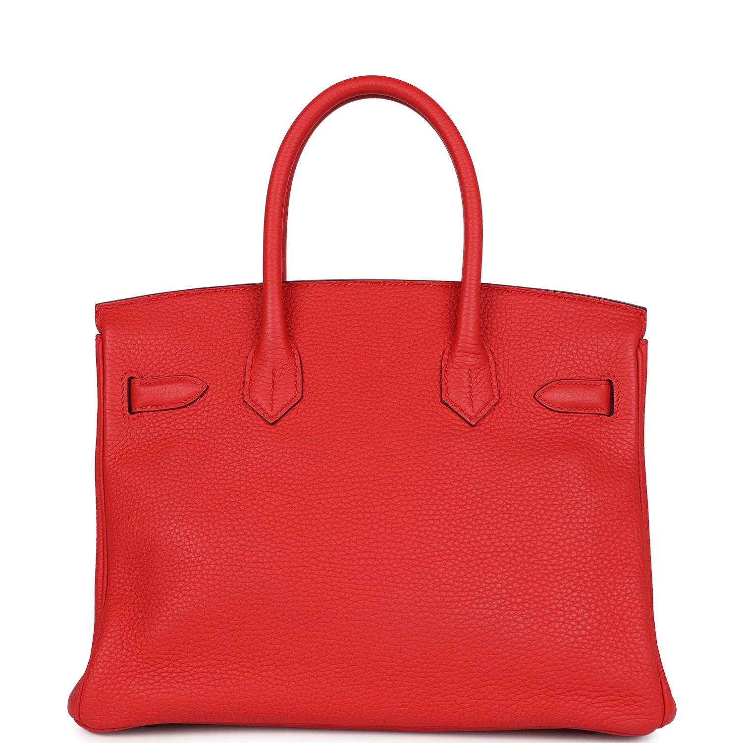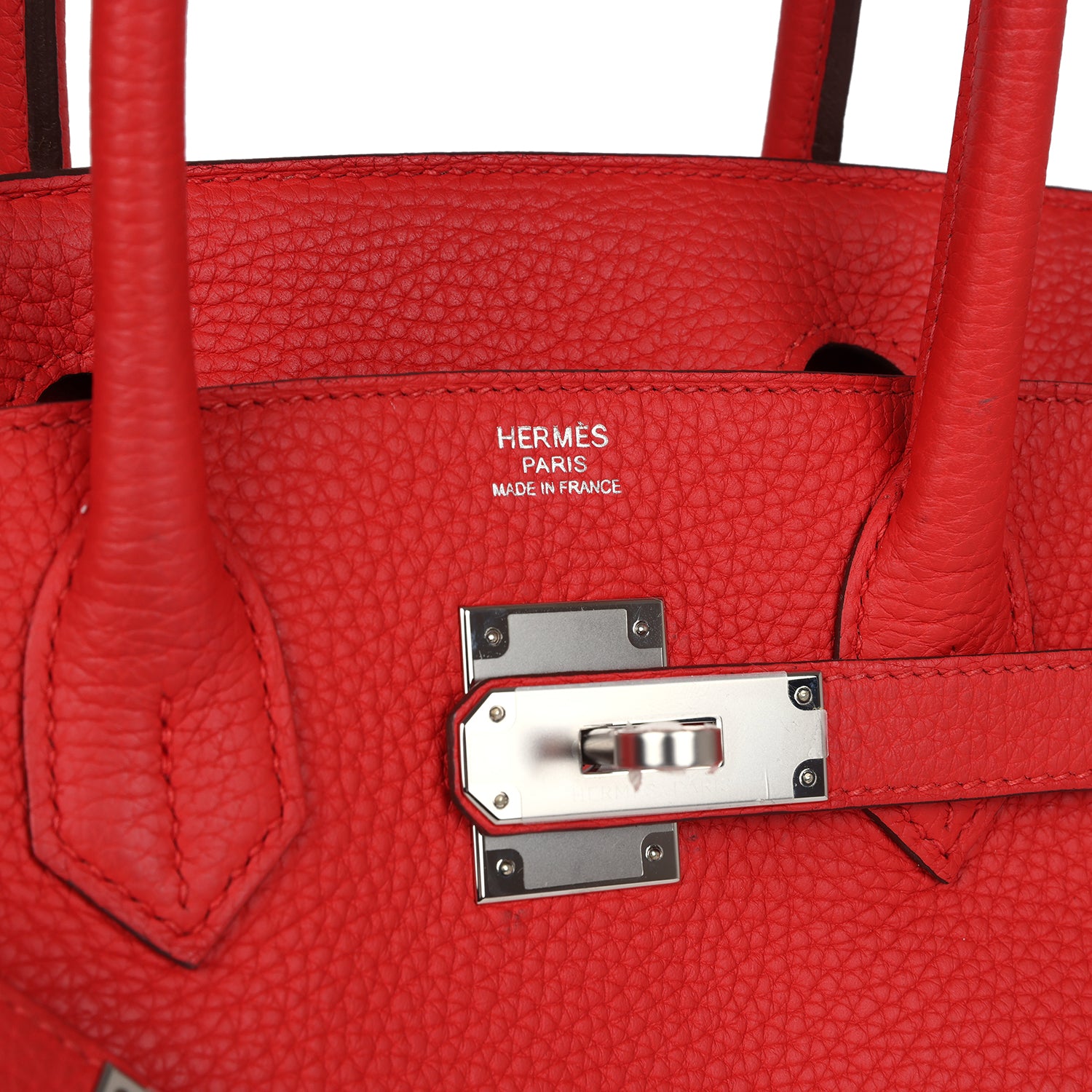 ThisBirkin is in Rouge Tomate clemence leather with palladium hardware, tonal stitching, front flap with two straps, front toggle closure, clochette with lock and two keys, and double rolled handles.