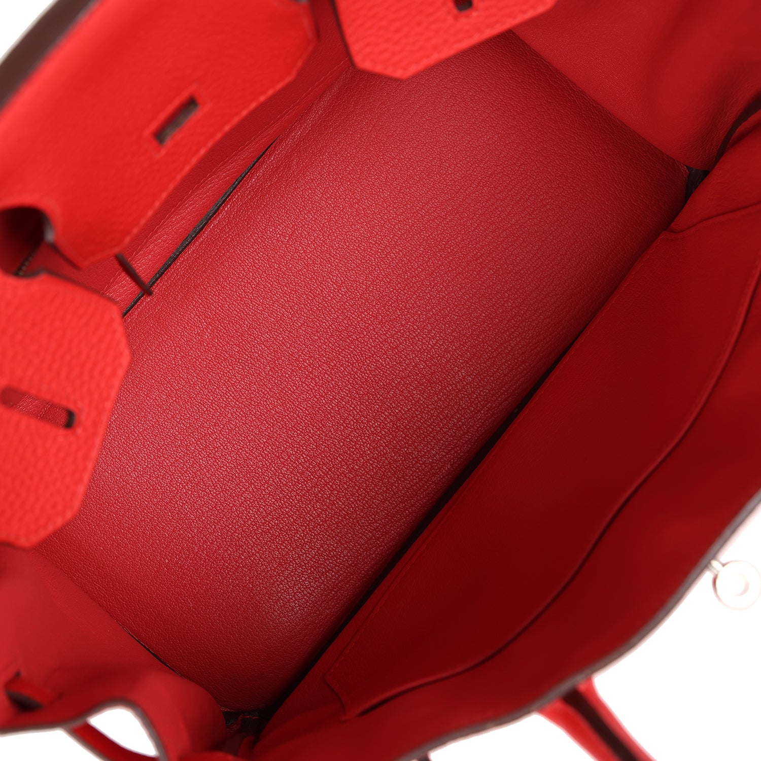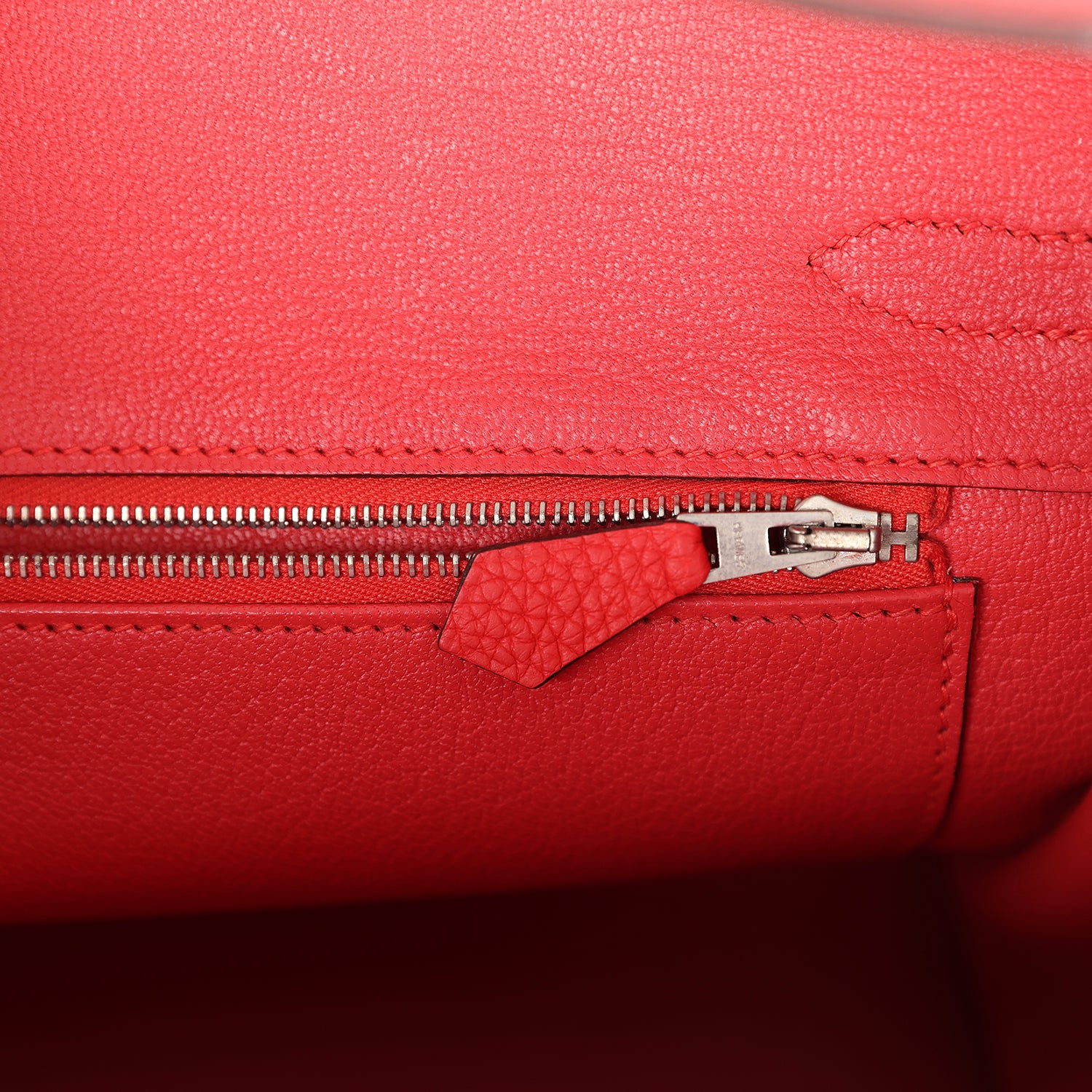 The interior is lined in Rouge Tomate chevre leather and has one zip pocket with Hermès engraved pull and one pocket on opposite side.