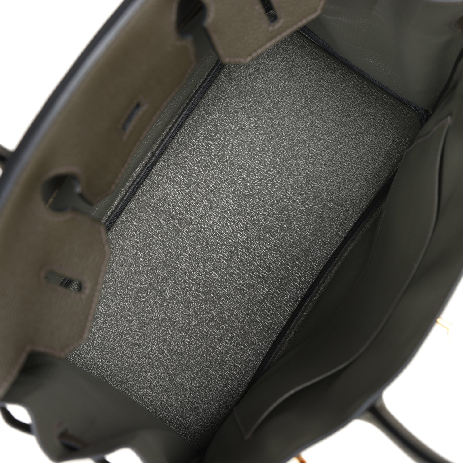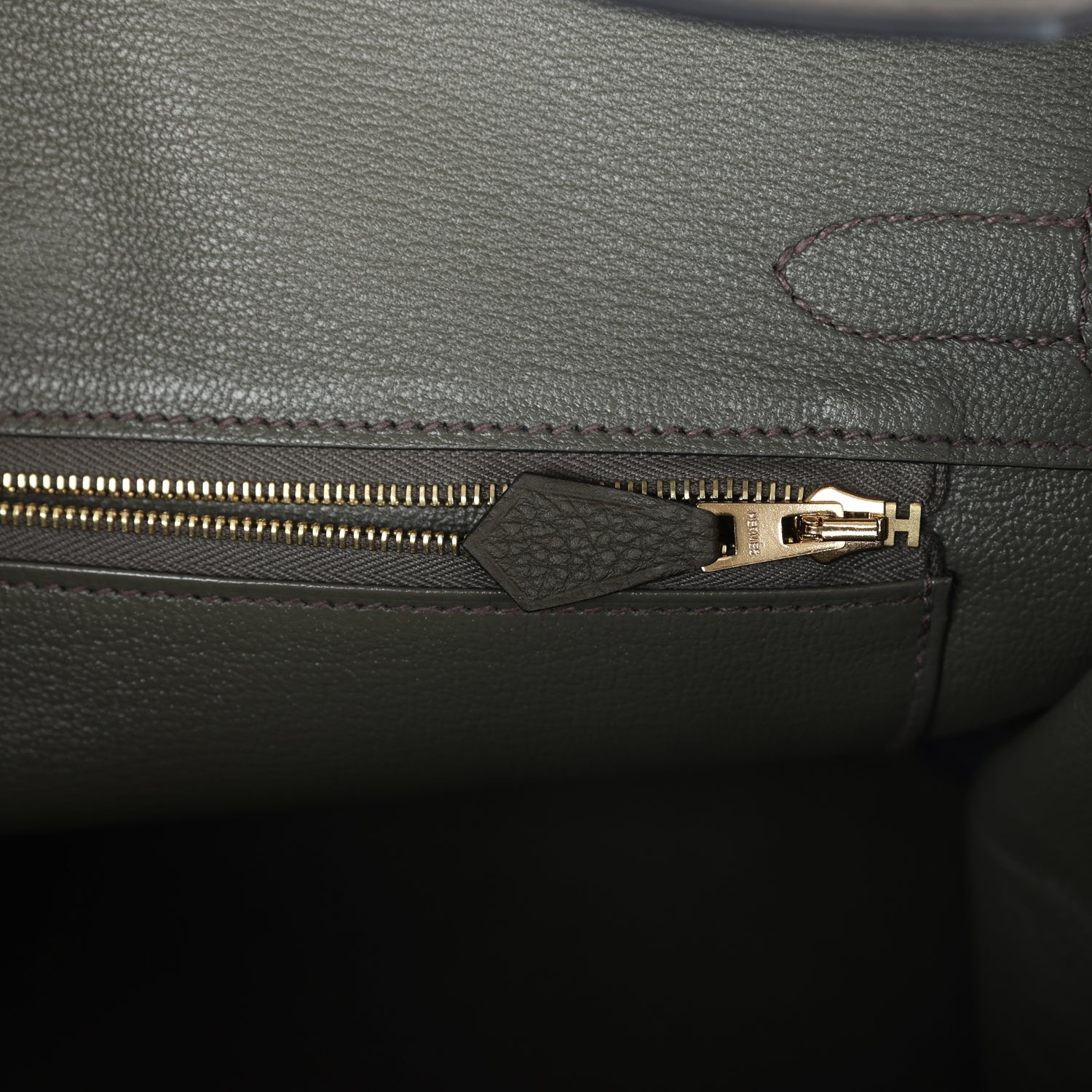 The interior is lined with Vert de Gris chevre and has one zip pocket with an Hermès engraved zipper pull and an open pocket on the opposite side.