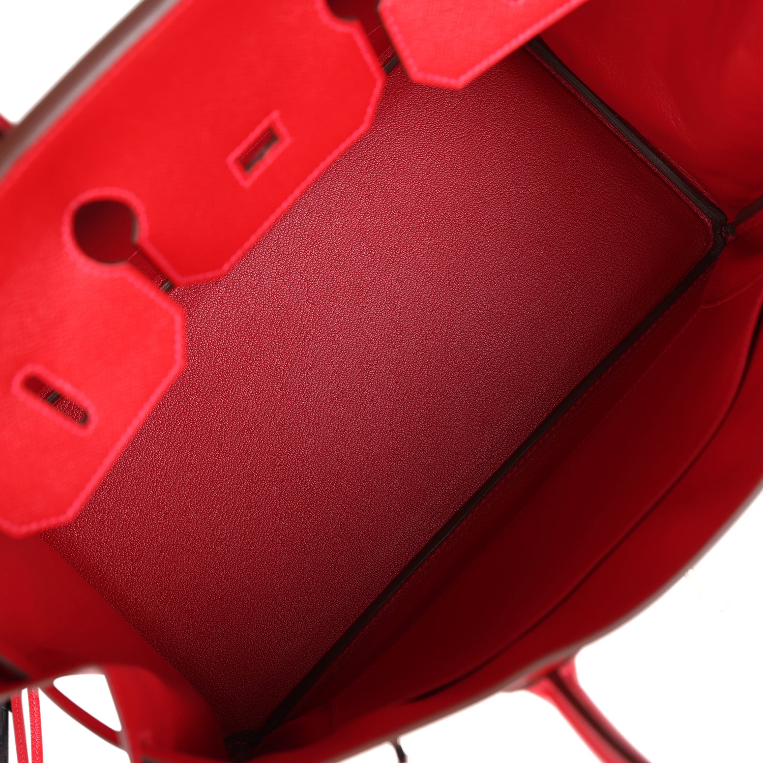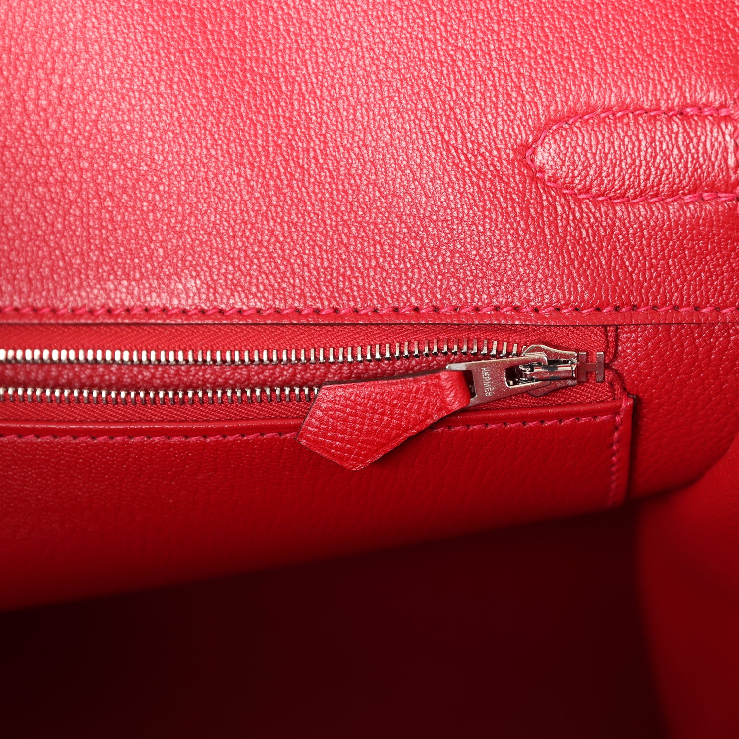The interior is lined withRouge Casaquechevre and has one zip pocket with an Hermès engraved zipper pull and an open pocket on the opposite side.