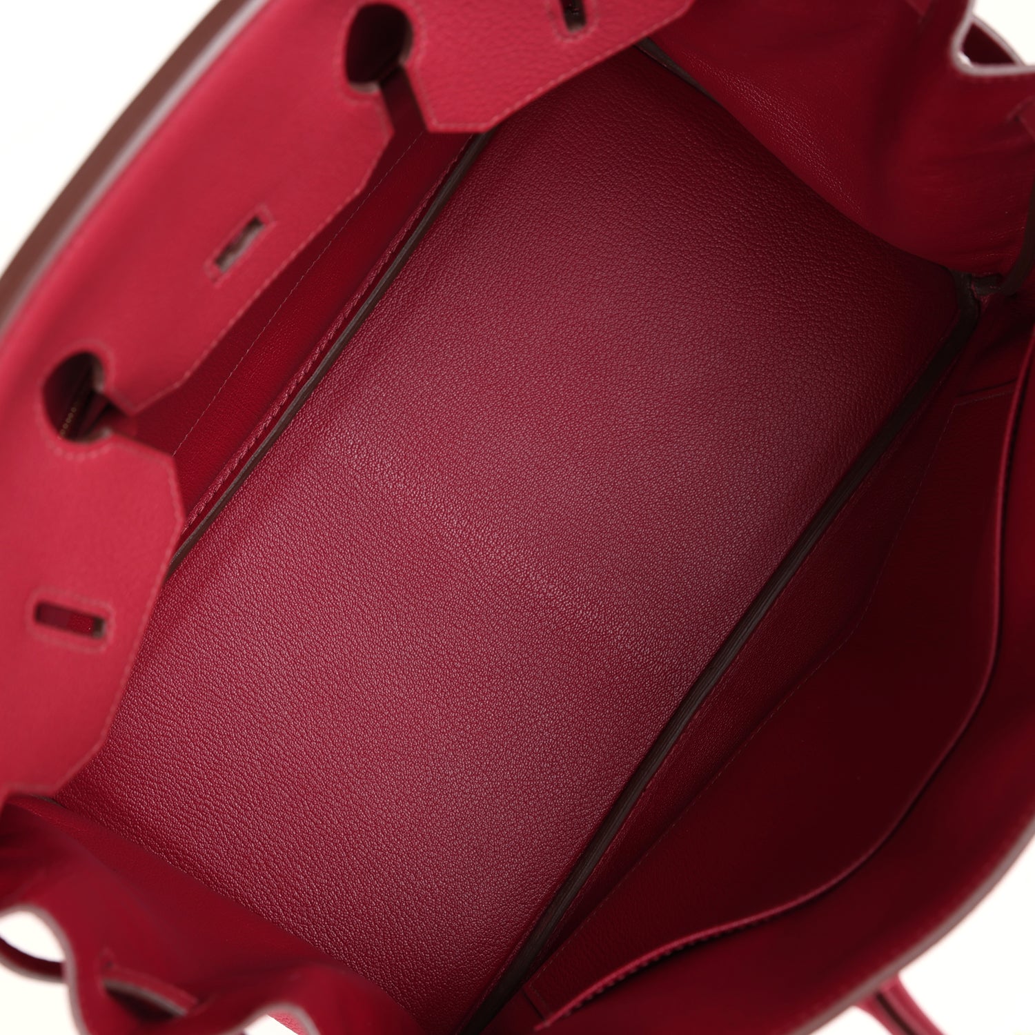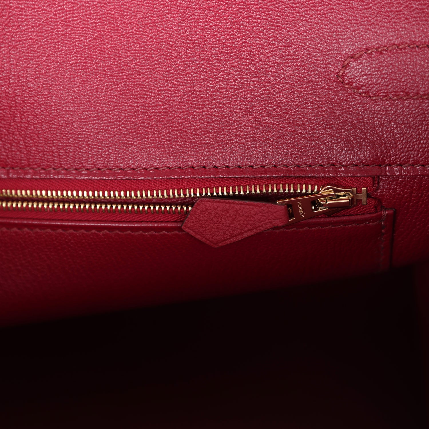 The interior is lined withRubis chevre and has one zip pocket with an Hermès engraved zipper pull and an open pocket on the opposite side.