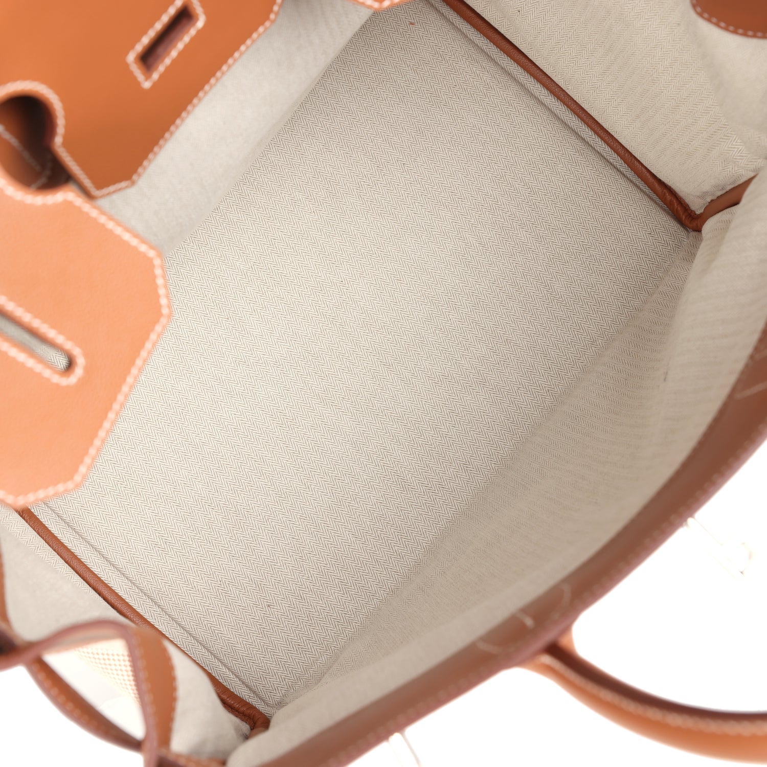 This HAC Birkin is in Gold evercolor leather and Ecru toile canvas with palladium hardware and has contrast stitching, two straps with HAC toggle closure, clochette with lock and two keys and double rolled handles.