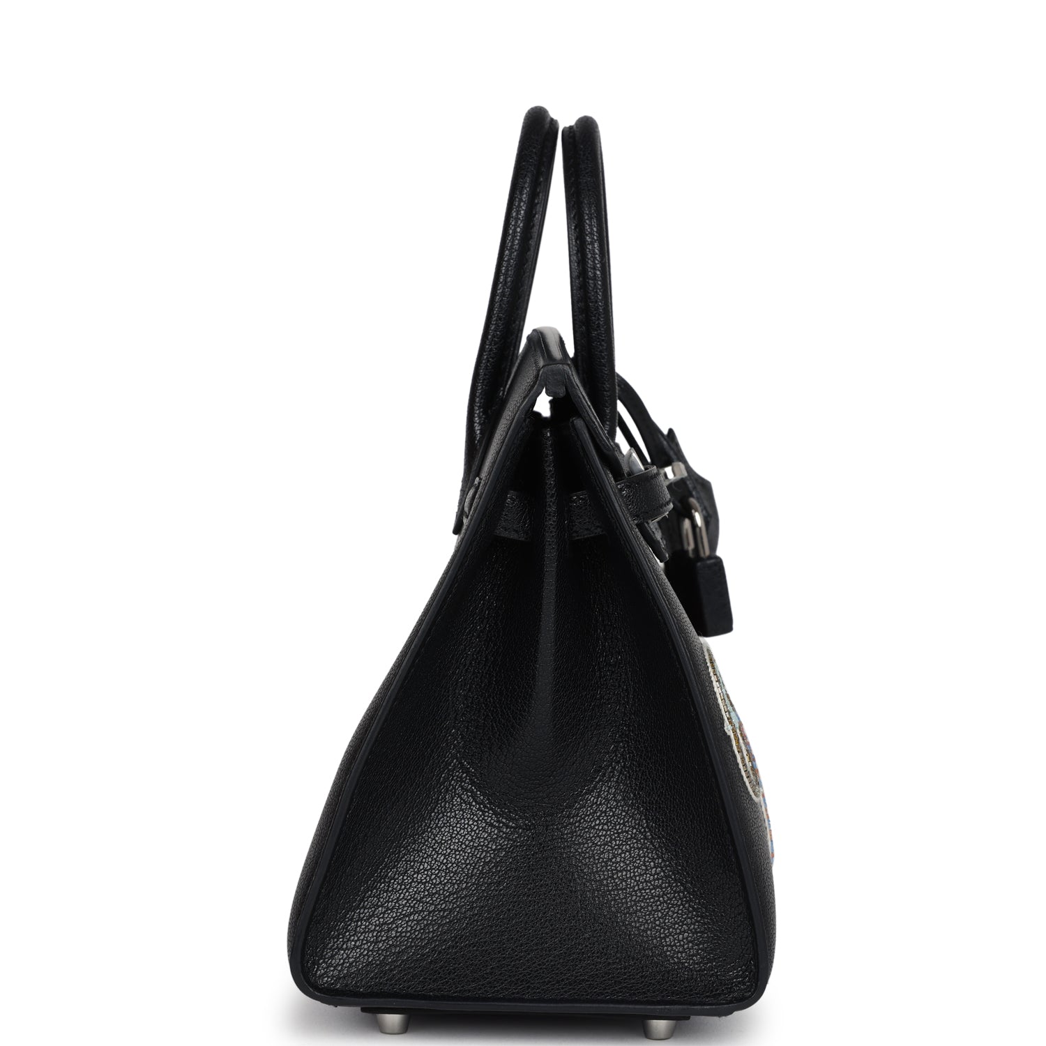 This limited edition “Bouclerie Moderne Casaque” Birkin is of Black Chevre Chamkila leather with palladium hardware featuring, tonal stitching, multicolored beaded belt buckles on front of the bag, front flap with two straps, front toggle closure, clochette with lock and two keys, and two rolled handles.
