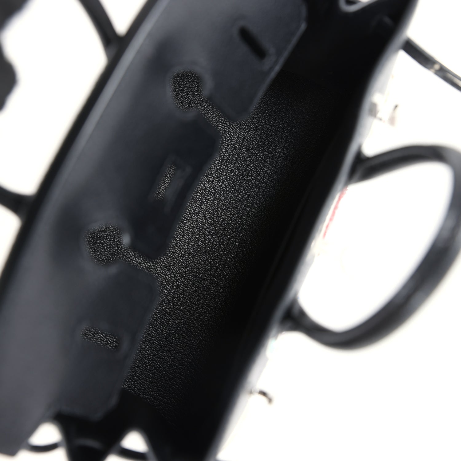 The interior is lined with Black chevre and has one slip pocket on the back wall.
