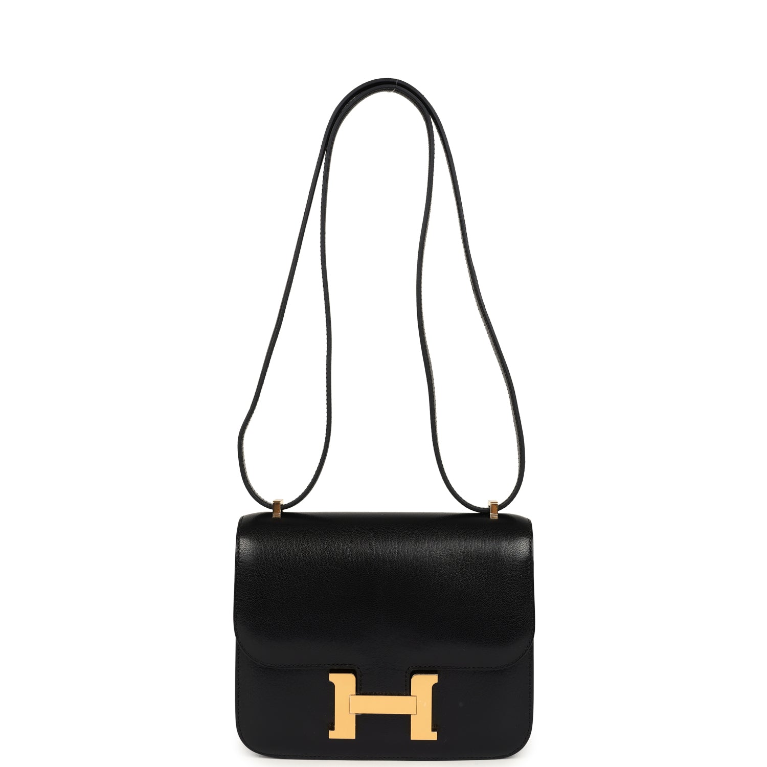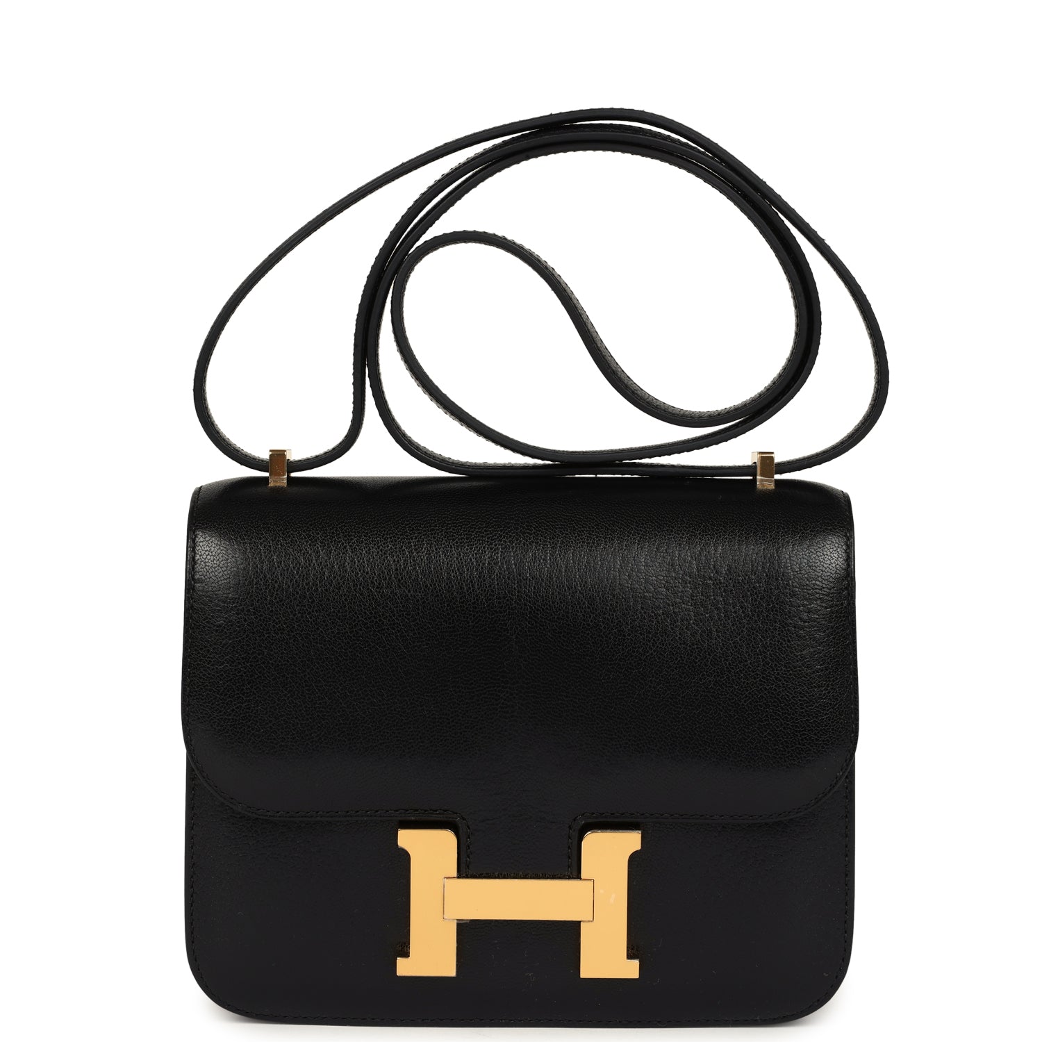 This Constance is inBlackchevre chamkila leatherwith gold hardware and hastonal stitching, ametal “H” snap lock closure and adjustable shoulder strap.