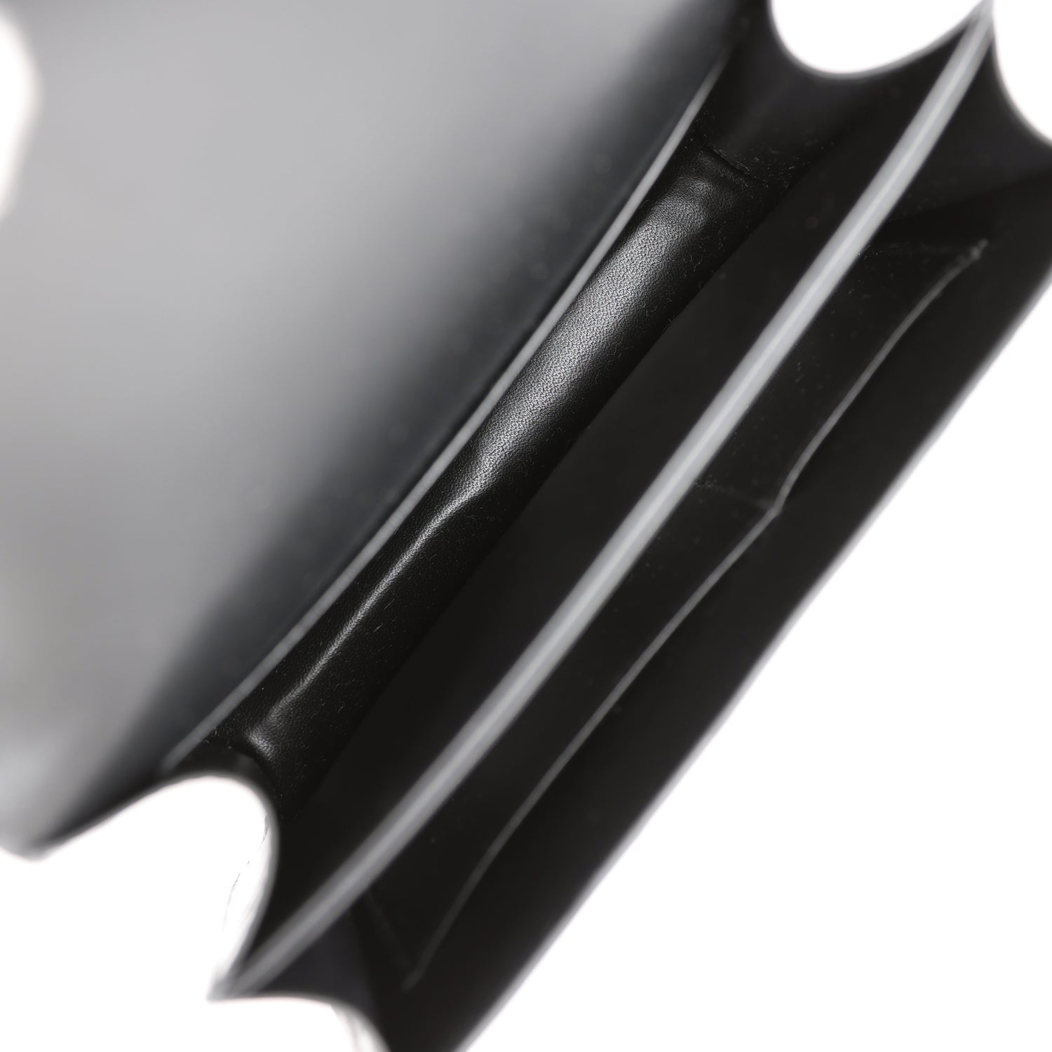 The interior is lined withBlack lambskin and has an open pocket on the front wall, a center divide, and a slit pocket on the back wall.