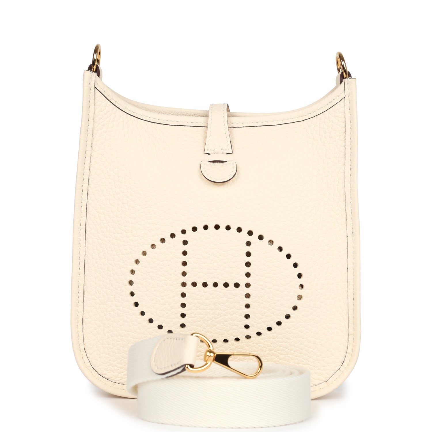 This Evelyne TPM is in Nata clemence leather with gold hardware and features tonal stitching, large perforated H in circle (front), pull tab top closure and a matching removable canvas and leather shoulder/crossbody strap.