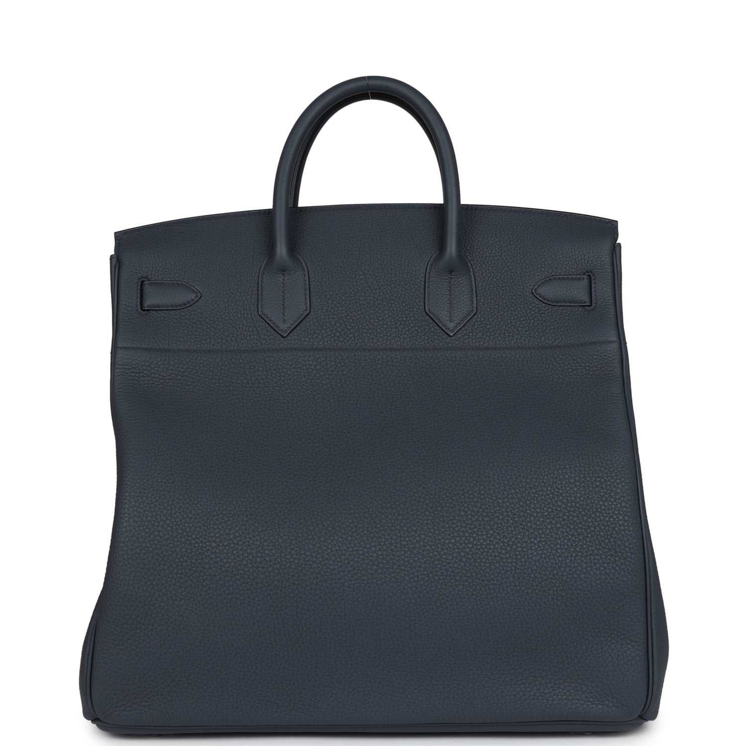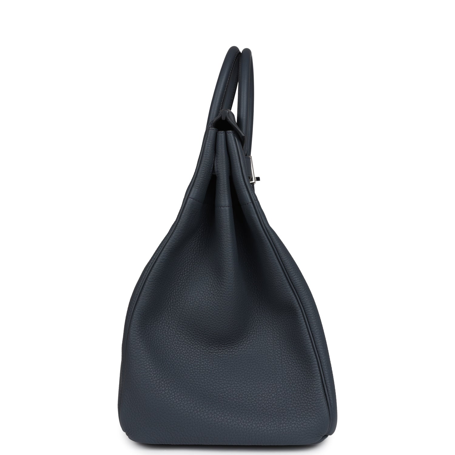 This HAC Birkin 40 is in Gris Misty togo leather with palladium hardware, tonal stitching, front flap with two straps, front toggle closure and clochette, lock and two keys, and double rolled handles.