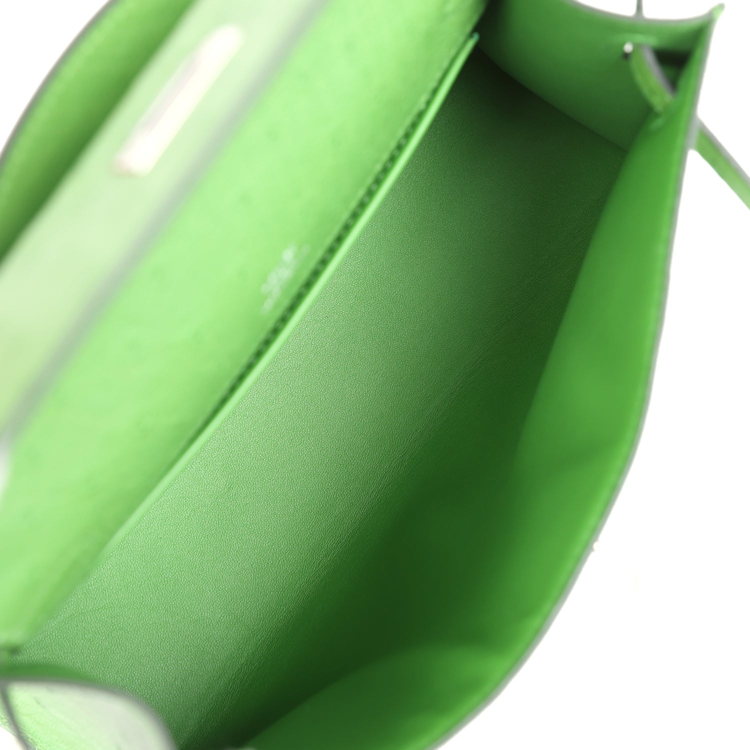 The interior is lined with Vert Yucca lambskin and has an open wall pocket.
