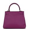 This Kelly Pochette is in White swift leather with palladium hardware and has tonal stitching, front flap, two straps with center toggle closure and a top flat handle.