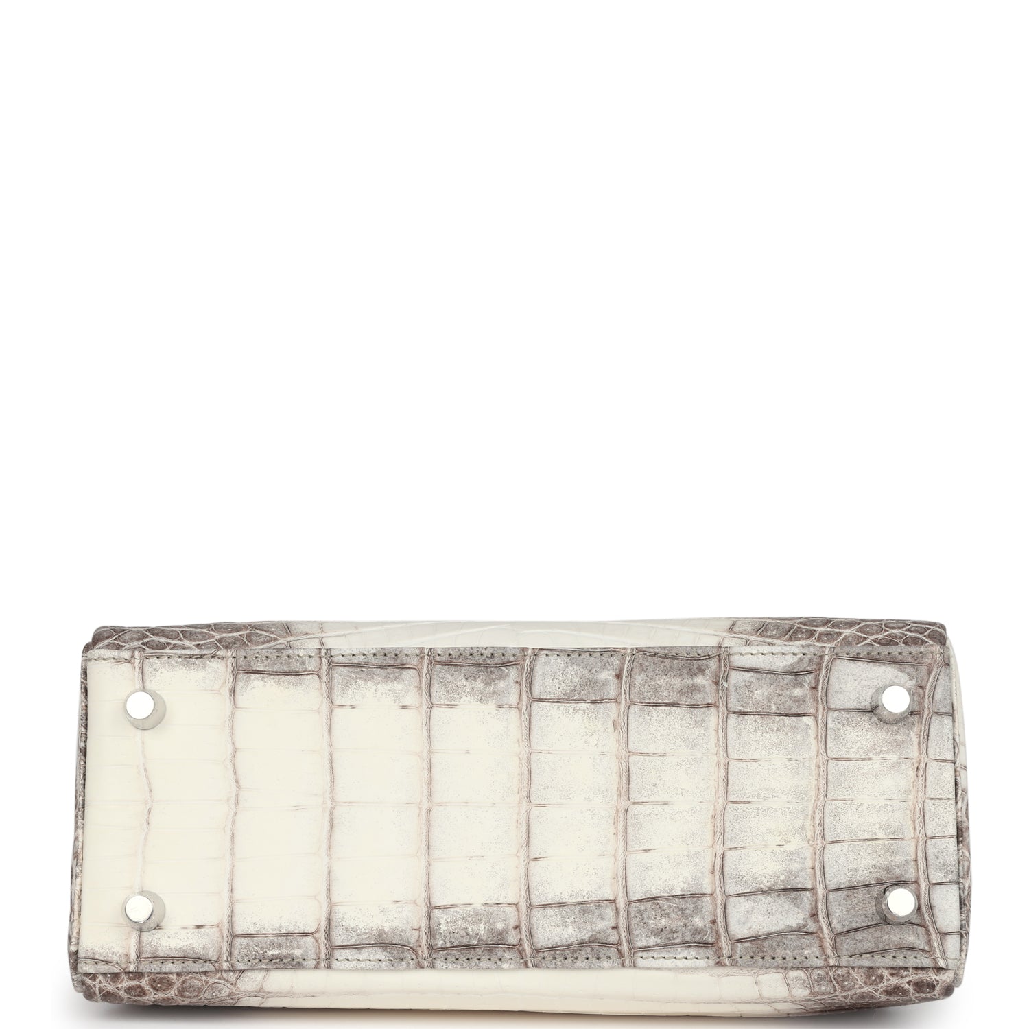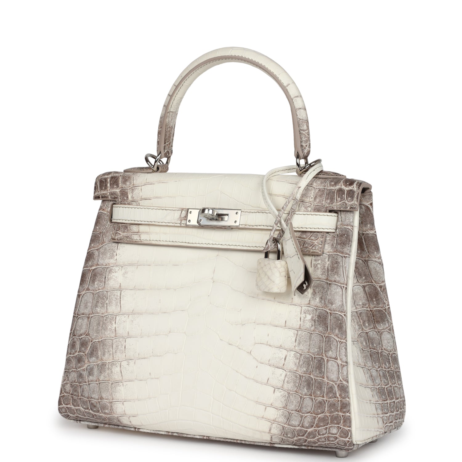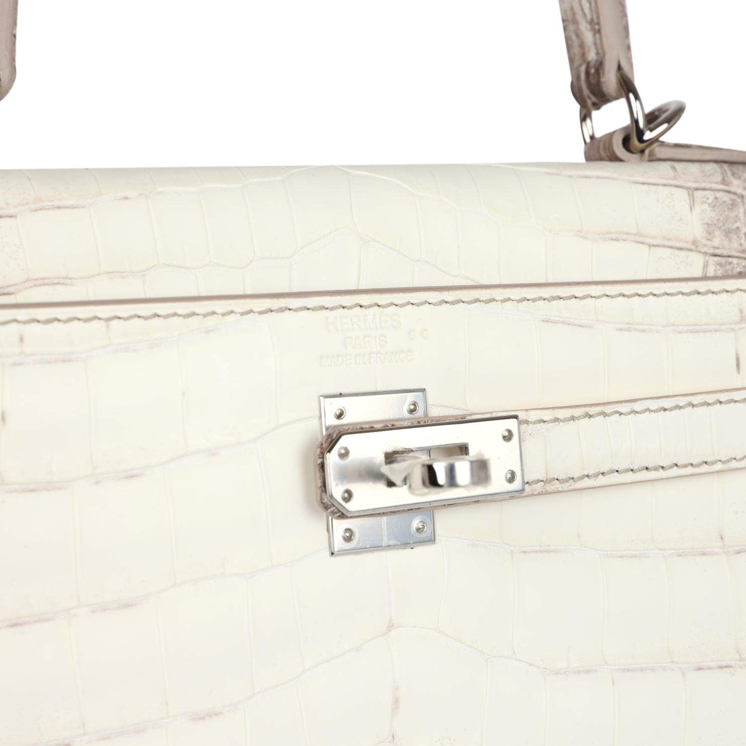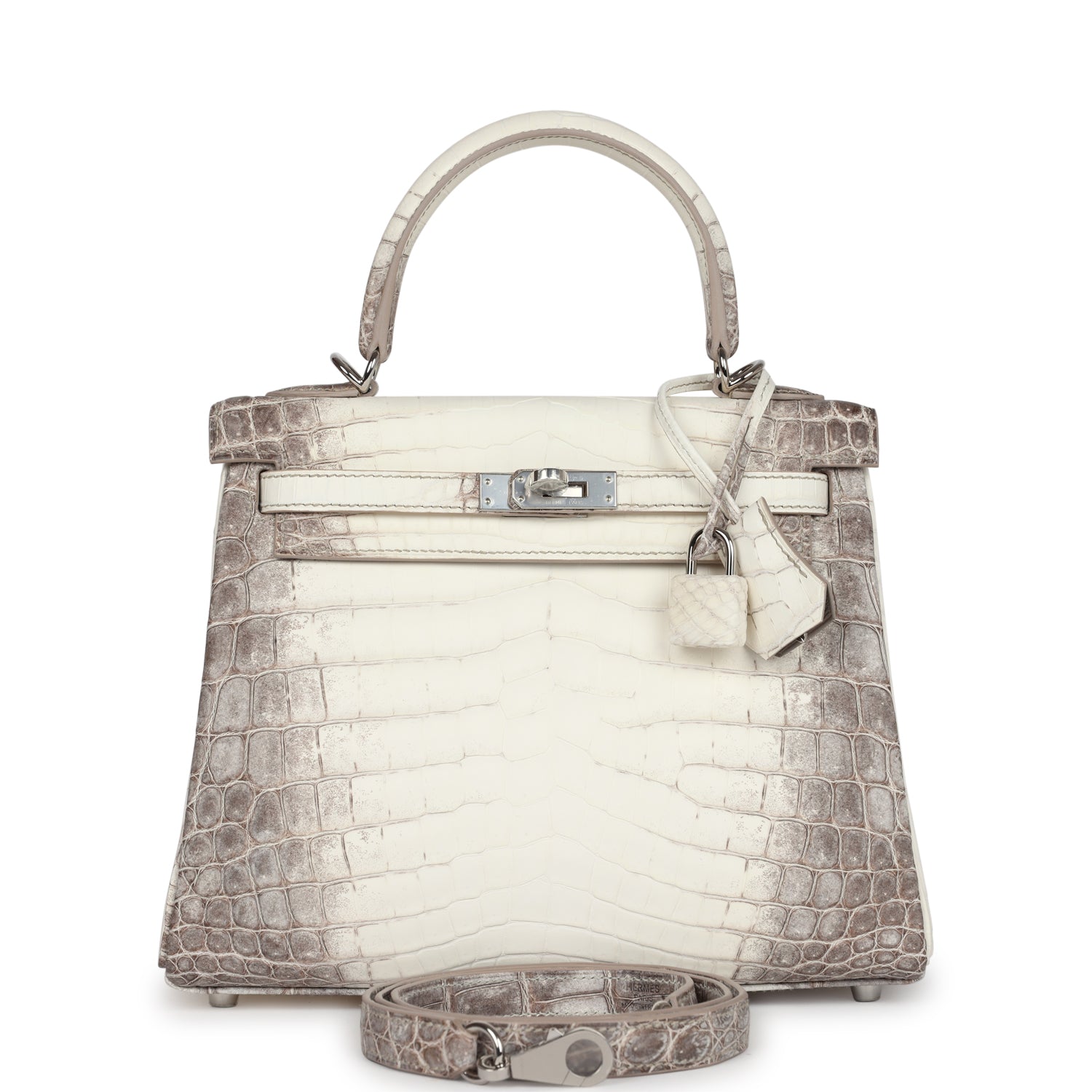 This Retourne style, Kelly is in Himalaya Matte Niloticus Crocodile leather with palladium hardware and has contrast stitching, front flap, two straps with center toggle closure, clochette with lock and two keys, single rolled handle and removable strap.