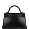 This Kelly, in the Sellier style, is inCeleste epsom leather with gold hardware andhastonal stitching, two straps with front toggle closure, single rolled handle and removable shoulder strap.