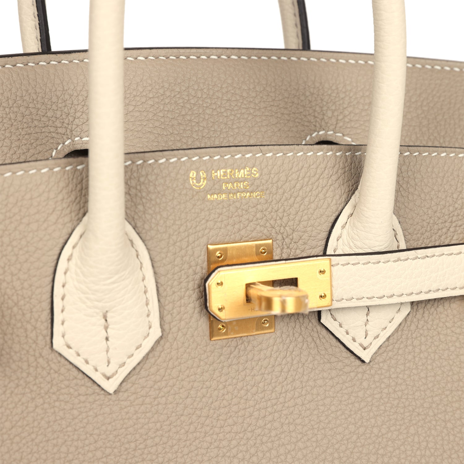 This special order Birkin is in Gris Tourterelle and Craie togo leather with brushed gold hardware and hascontrast stitching, front flap, two straps with center toggle closure, clochette with lock and two keys, and double rolled handles.