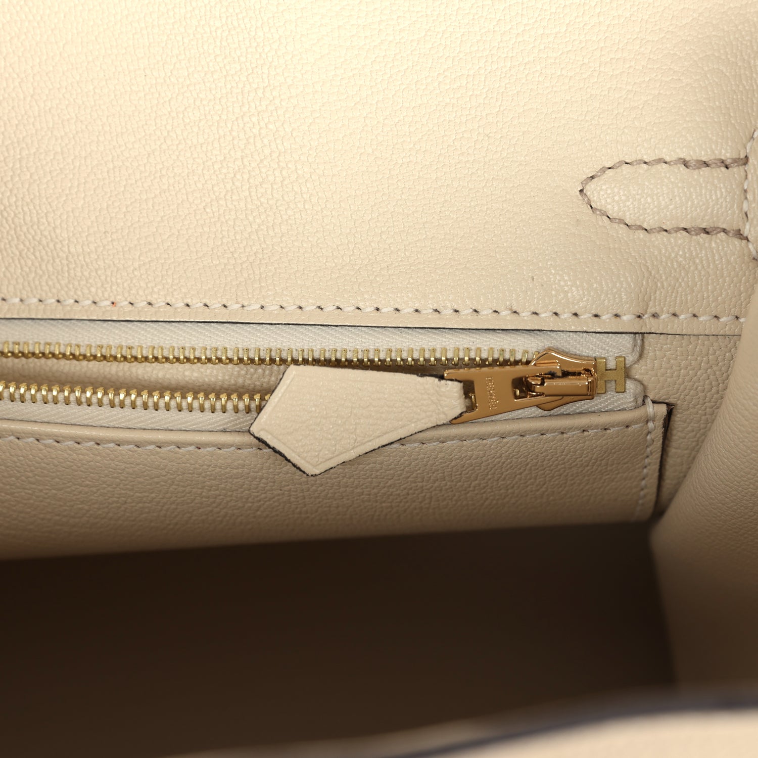 The interior is lined with Craie chevre and has one zip pocket with an Hermès engraved zipper pull and an open pocket on the opposite side.