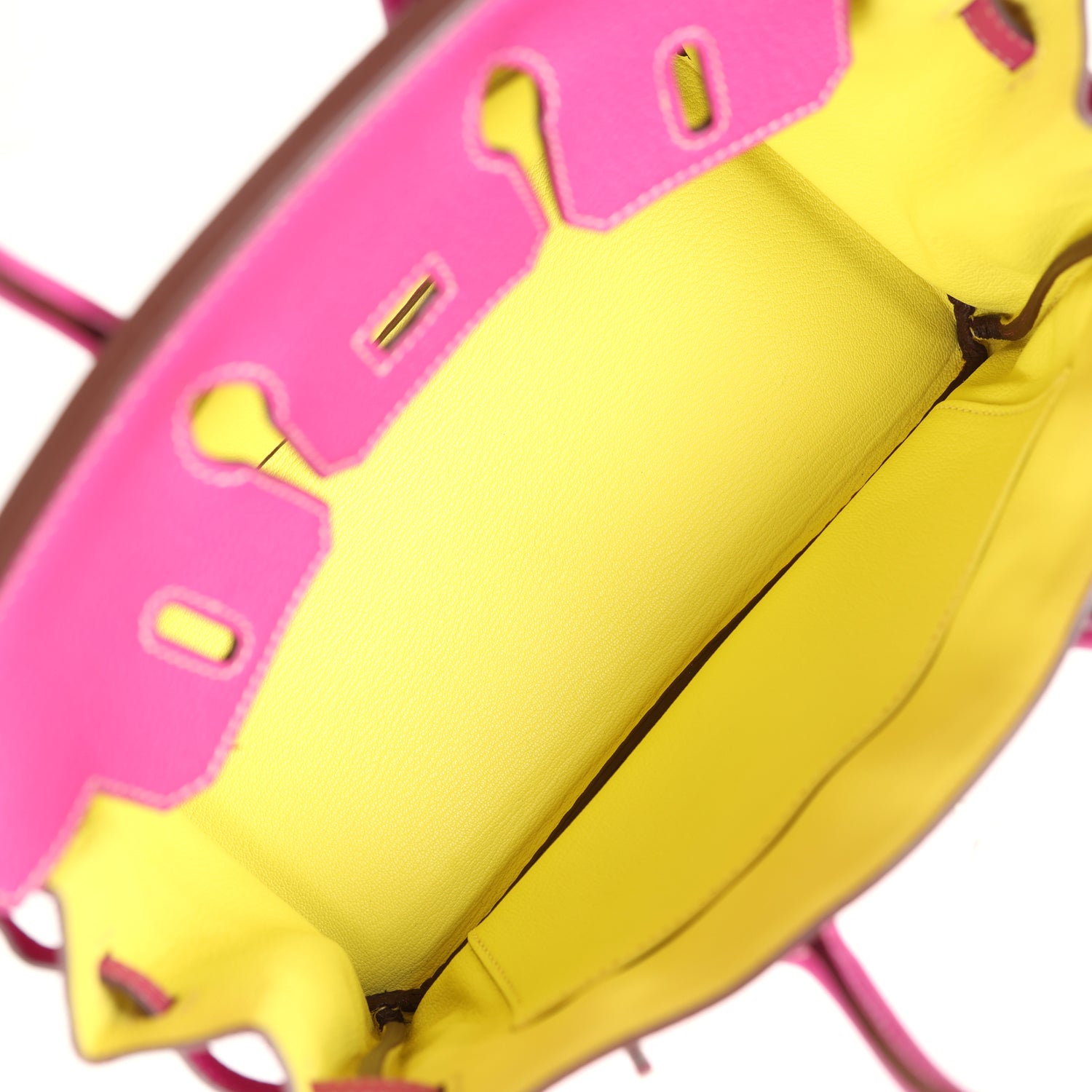 The interior is lined with Lime chevre and has one zip pocket with an Hermès engraved zipper pull and an open pocket on the opposite side.