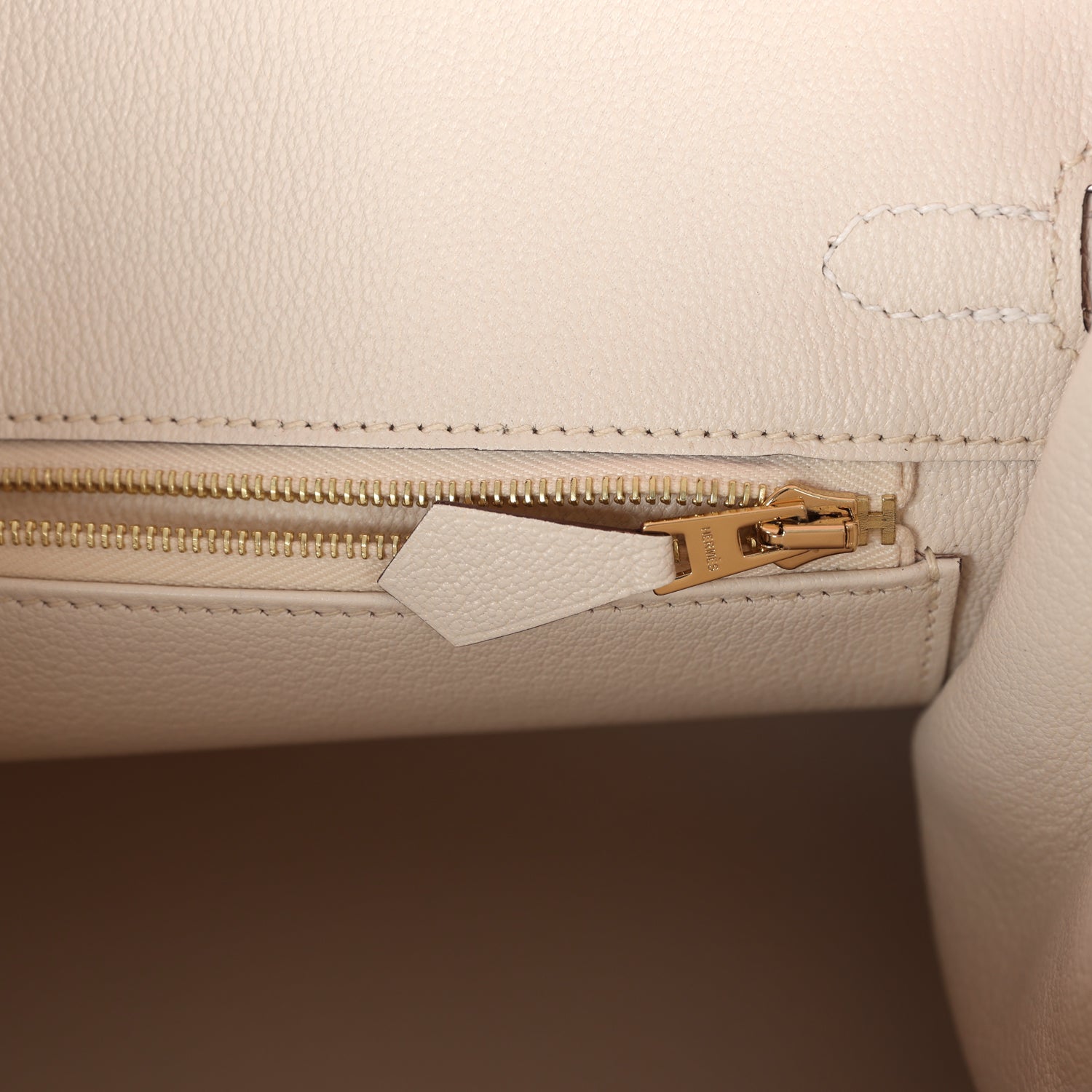 The interior is lined with Nata chevre leather and has one zip pocket with an Hermès engraved zipper pull and an open pocket on the opposite side.