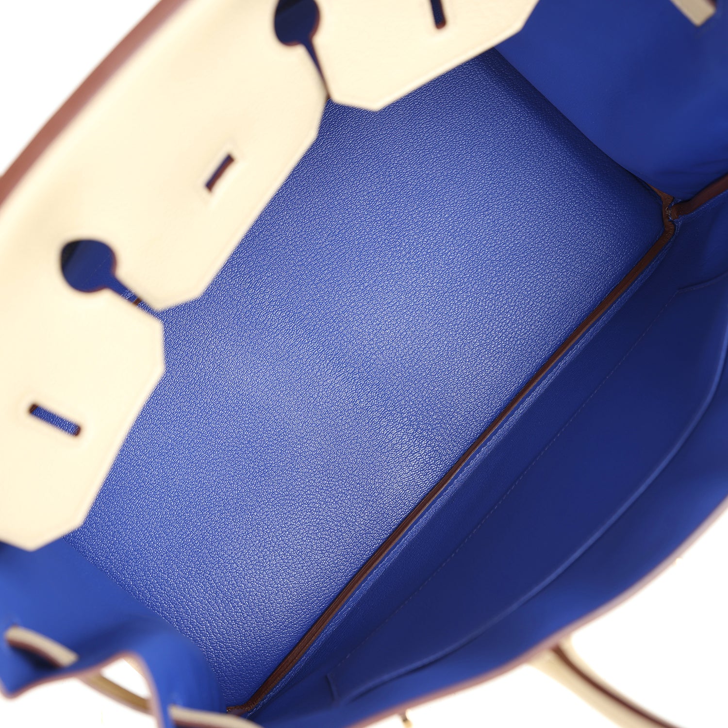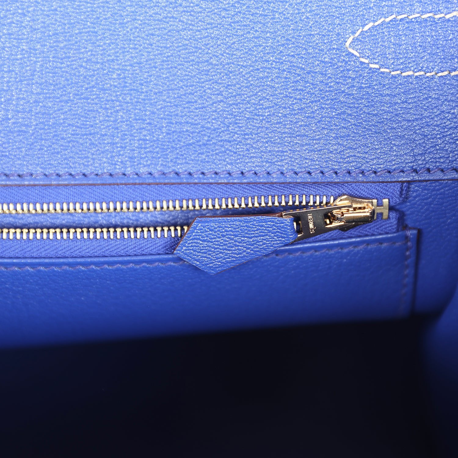The interior is lined withBleu Royalchevre and has one zip pocket with an Hermès engraved zipper pull and an open pocket on the opposite side.