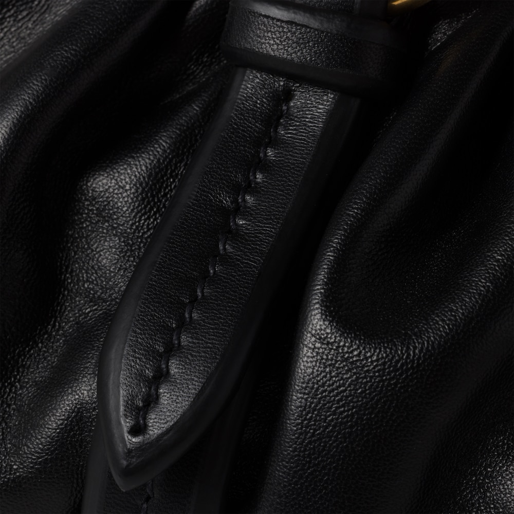 The Joie nappa leather bag, a style recovered from the Miu Miu archives, is reinterpreted in terms of its light, casual, and compact structure and attitude, creating a bag with timeless charm. The leather trick adds a refined detail while the lettering logo in relief completes the design with an iconic note.