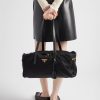 This structured top-handle bag, crafted from Re-Nylon and leather, presents a timeless silhouette with sophisticated charm. The metal hardware and the enameled metal triangle logo adorn the style, while the zipper and padlock closure add a unique accent.