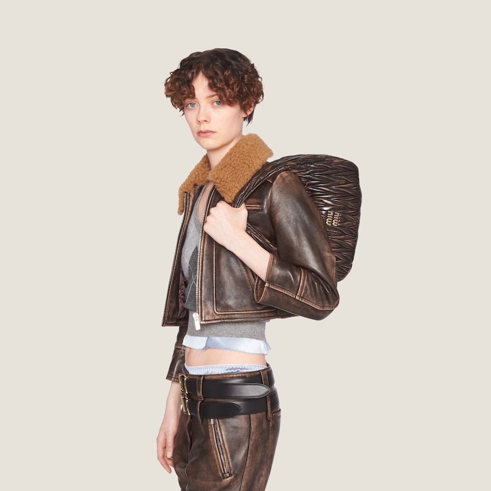 The Wander bag is reinterpreted season after season, becoming an iconic accessory of Miu Miu collections. Made with a unique technique that removes some of the color and is waxed at the end for a vintage effect, the bag is characterized by the sophisticated three-dimensional effect created by the fine workmanship. The hobo silhouette, a blend of retro inspirations and contemporary elegance, becomes a new expression of modern femininity.