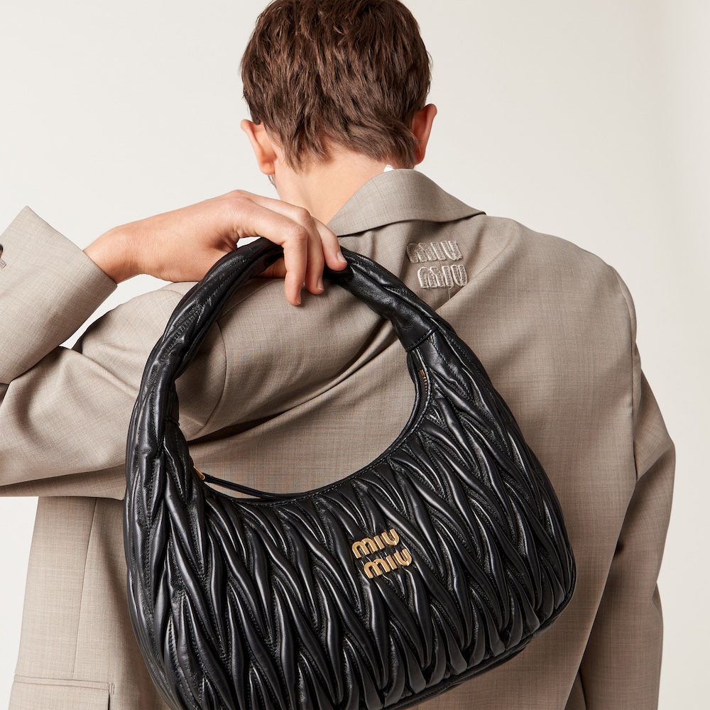 The Wander bag, reinterpreted season after season, has become an iconic accessory of Miu Miu collections. $ Made in matelassé nappa leather, the bag is characterized by the sophisticated, three-dimensional created by the fine workmanship. The hobo shape, blending retro inspirations and contemporary elegance, becomes a new synonym of modern femininity.