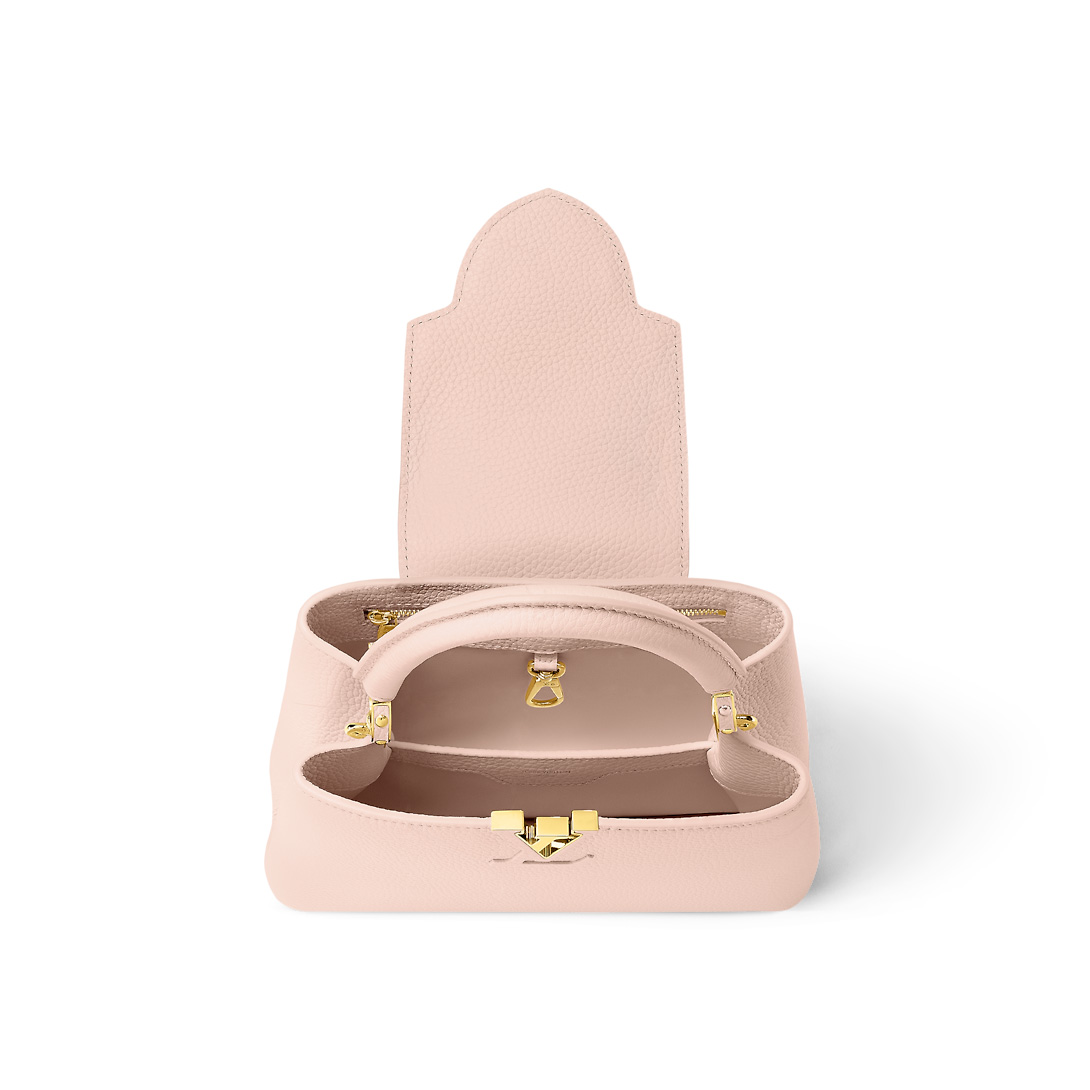 Fashioned from full-grained Taurillon leather, this Capucines BB handbag comes in an ultra-feminine colorway inspired by the flowers of the pink jasmine plant. It features a rolled-leather top handle and a wide removable strap for shoulder and cross-body carry. The versatile Capucines can be carried with the flap inside or outside.