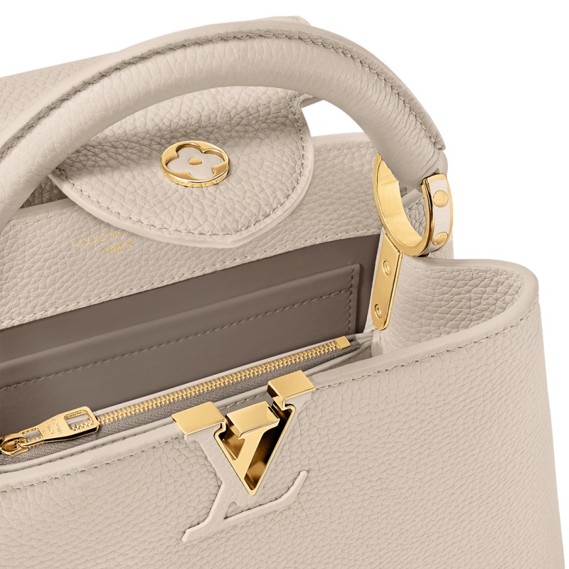 Fashioned from full-grain Taurillon leather, the now-classic Capucines BB handbag displays a host of House signatures:leather-wrapped LV Initials, jewel-like handle mounts inspired by historic trunks, and a distinctive flap with a Monogram Flower motif. Timelessly elegant, this charming model can be carried by hand or worn cross-body on its detachable strap. First launched in 2013, the Capucines is named for the Parisian street where Louis Vuitton first opened shop, in 1854.
