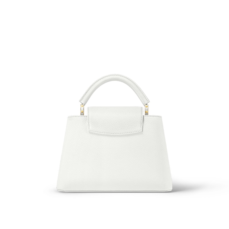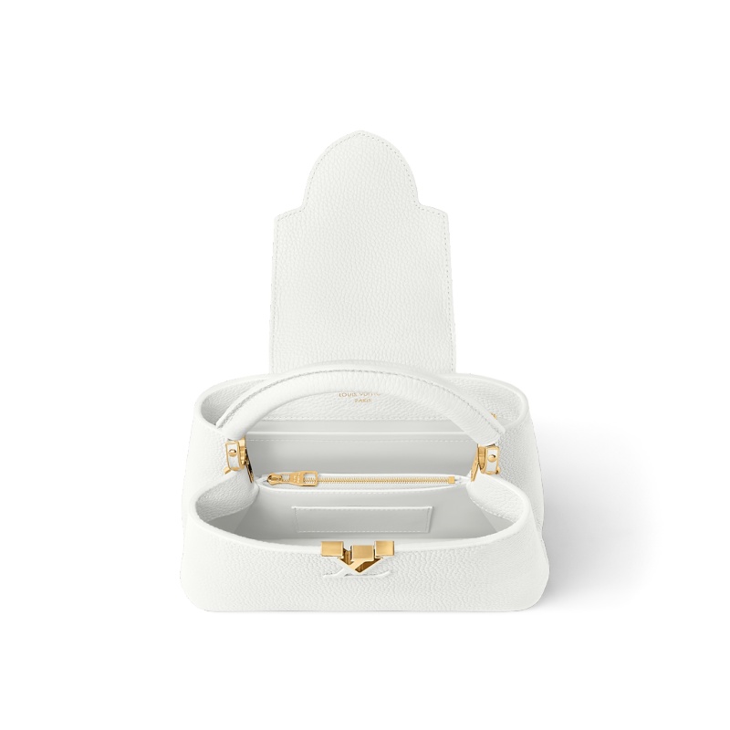 Fashioned from full-grain Taurillon leather, the now-classic Capucines BB handbag displays a host of House signatures:leather-wrapped LV Initials, jewel-like handle mounts inspired by historic trunks, and a distinctive flap with a Monogram Flower motif. Timelessly elegant, this charming model can be carried by hand or worn cross-body on its detachable strap. First launched in 2013, the Capucines is named for the Parisian street where Louis Vuitton first opened shop, in 1854.