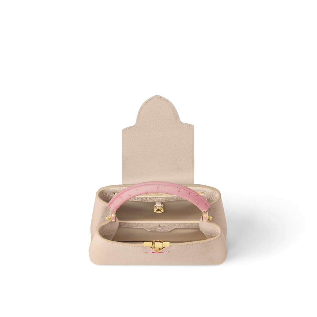 The sumptuous Taurillon leather of this Capucines BB handbag looks great in soft beige. The flap is in pale-pink ostrich leather. As is the elegant top handle. The flap can be tucked inside to feature the LV signature or outside to display a simple Monogram Blossom. A wide removable strap gives carry options.