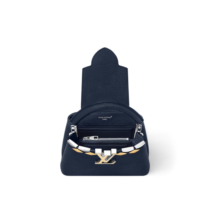 This seasonal iteration of the Capucines Mini reveals a new Malletage crown signature with striking diamond-shaped embellishments. It is crafted from Taurillon leather, offset with a mix of gold- and silver-toned hardware. The double-carry design can be styled with the flap tucked inside or outside, and opens to a compartmented interior with enough space to fit all the essentials.