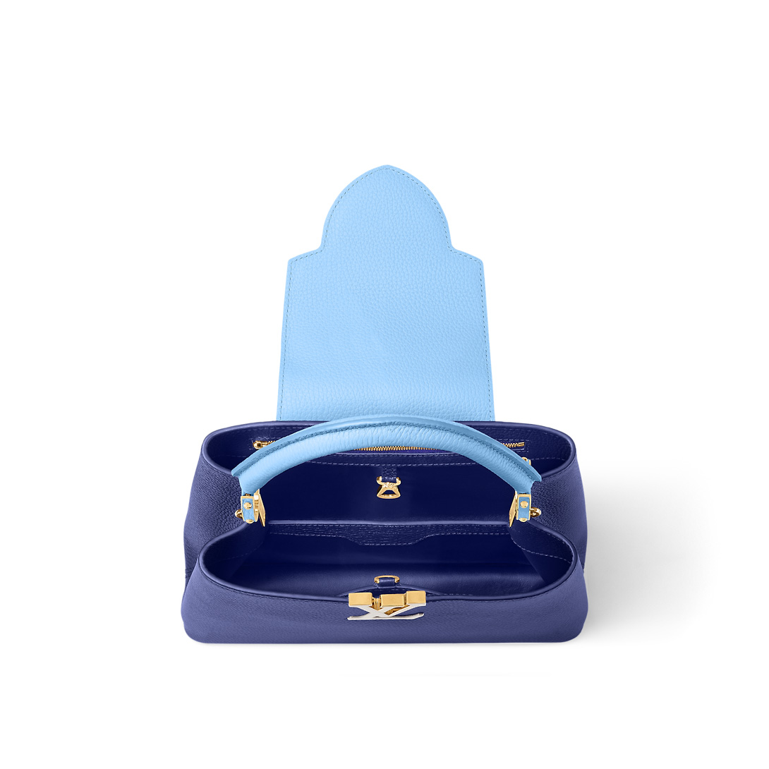 This Capucines MM handbag plays with contrasting color blocks:on the bag, on the flap, on one side of the shoulder strap, on the other… The combination of blues with white brings an understated sophistication to this classic woman’s handbag in full-grain Taurillon leather, with its LV initials and the jewel-like handle mounts.