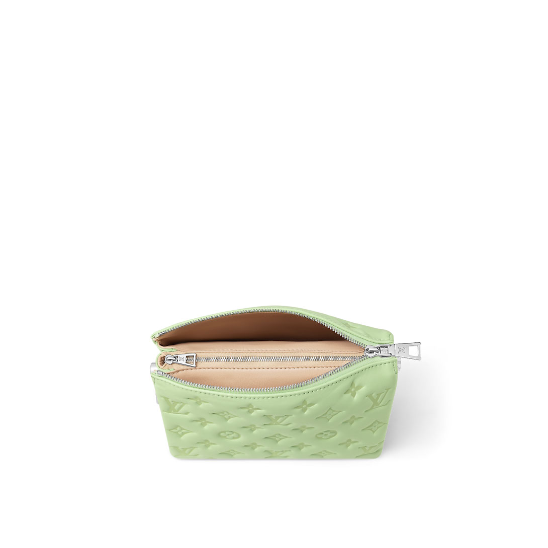 Fashioned from padded lambskin with Monogram embossing, the Coussin BB handbag features a chunky chain with Plexiglass links for a colorful touch. The Plexiglas links, in the same color as the bag, alternate with gold-color metallic links engraved with LVs and Monogram Flowers. A detachable leather strap gives additional carry options.