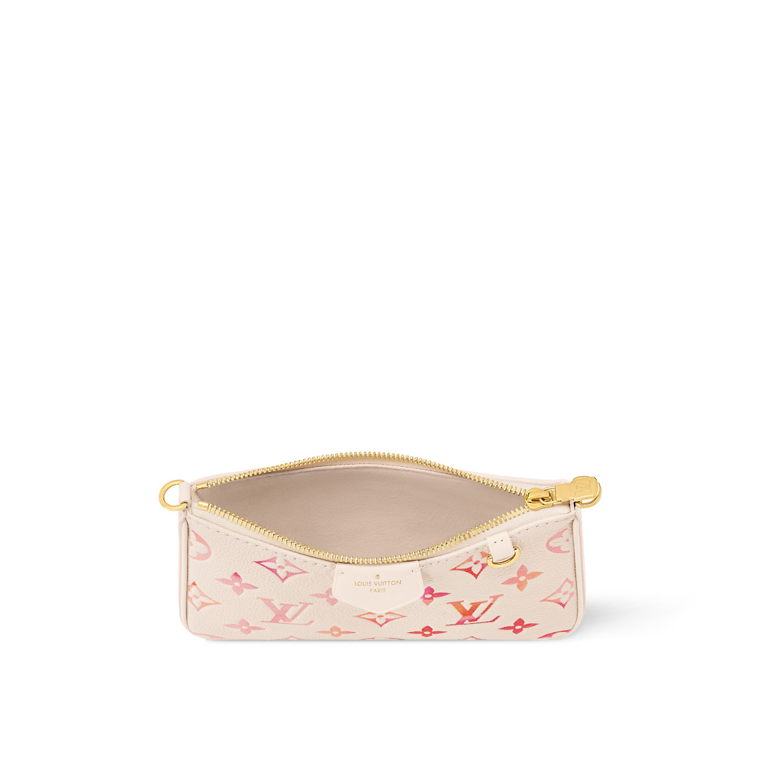 This edition of the Easy Pouch on Strap belongs to the Sunrise Aquarelle collection. It is crafted from Monogram Empreinte leather, which is digitally printed with a gradation of oranges and pinks evoking a watercolor painting. Large enough for everyday essentials, this bag has a removable chain and a removable, adjustable strap for shoulder or cross-body carry.