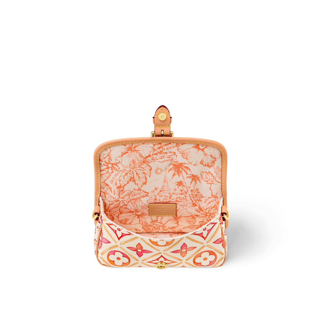 This edition of the Nano Diane bag belongs to the LV By the Pool summer collection. It comes in coated canvas printed with a colorful Monogram Tiles motif which evokes the Mediterranean. Leather trim complements this miniature version of the Diane bag, which is distinguished by its rounded flap and belt-style closure.