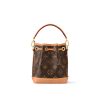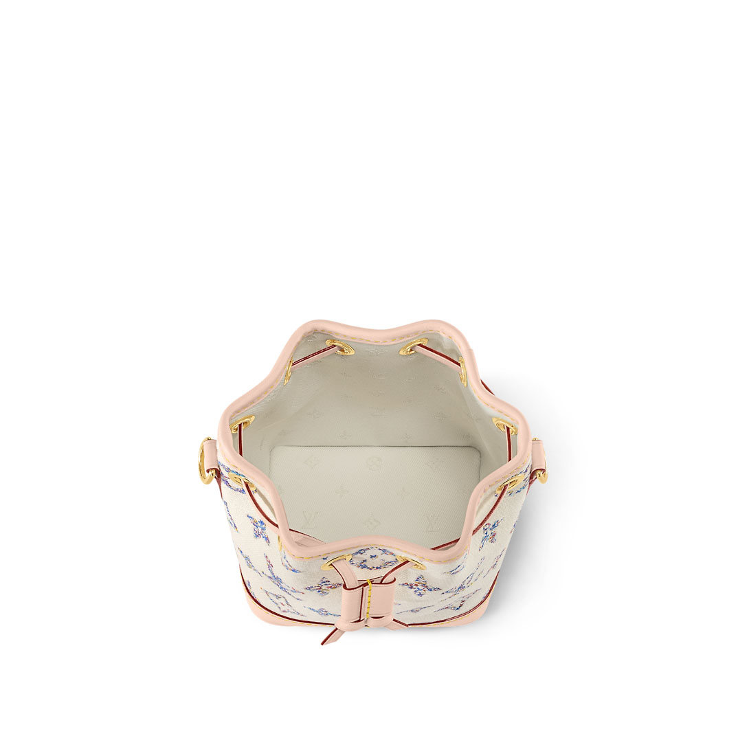 This exclusive edition of the Nano Noé is crafted from Monogram jacquard fabric with a tweed-like appearance. A mini replica of the iconic Noé bag, this model is complemented by natural leather trim on its base, drawstring closure and removable, adjustable shoulder strap. Its handle, which is also removable, is a laced, gold-tone chain.