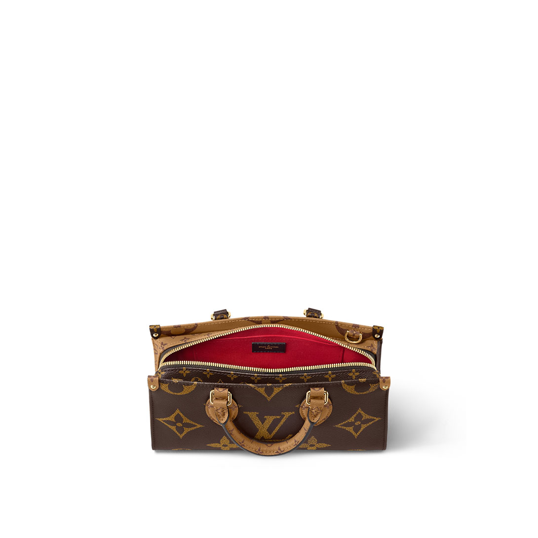 The Maison reinterprets the OnTheGo tote this season with a new east-west shape and a modern mix of Giant Monogram and Monogram Reverse canvas. Fitted with two Toron top handles and a wide, detachable strap, this beautifully proportioned bag can be styled in a variety of ways. A removable round coin purse completes this versatile design.