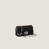 The iconic Cloquet motif distinguishes the design of the Miu Crystal bag, here with double shoulder strap:with crystals and woven nappa leather. $ The accessory is illuminated by the crystal-studded clasp.