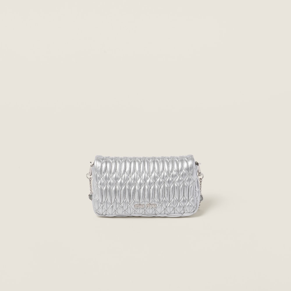 Sparkling crystals embellish the chain shoulder strap and define the sophisticated design of the Miu Crystal nappa leather bag. The quilted motif adds an iconic note to the bag.