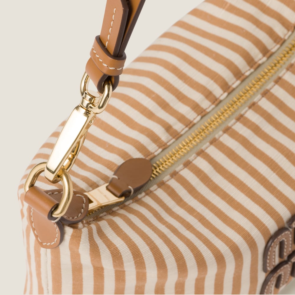 A vibrant stripe print characterizes this Miu Spirit fabric mini-bag. The leather handle echoes the leather logo that completes the design with an iconic touch.