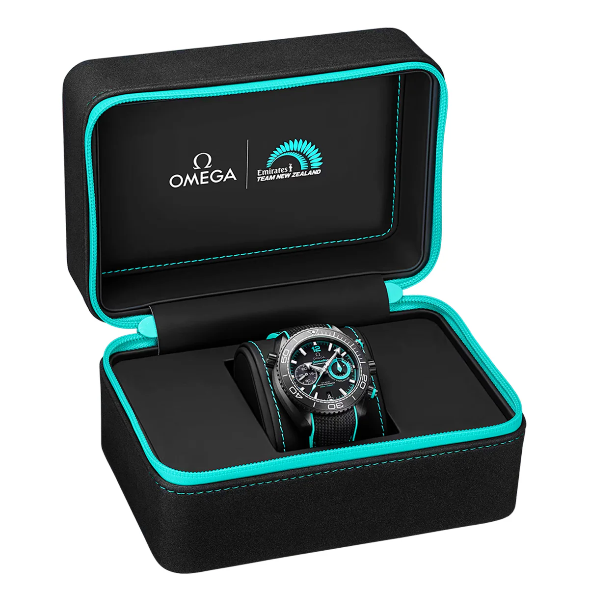 OMEGA Seamaster Planet Ocean 600m 45.5mm ETNZ Edition Deep Black Watch 21592465101003.Black ceramic 45.5mm case and bezel all on a black rubber strap. This men’s watch has a black dial with turquoise detail, date display at the 6 o’clock position. Special edition caseback with ETNZ team logo. Sapphire crystal glass and water resistant up to 600m. 60 hours power reserve. Automatic chronograph movement.