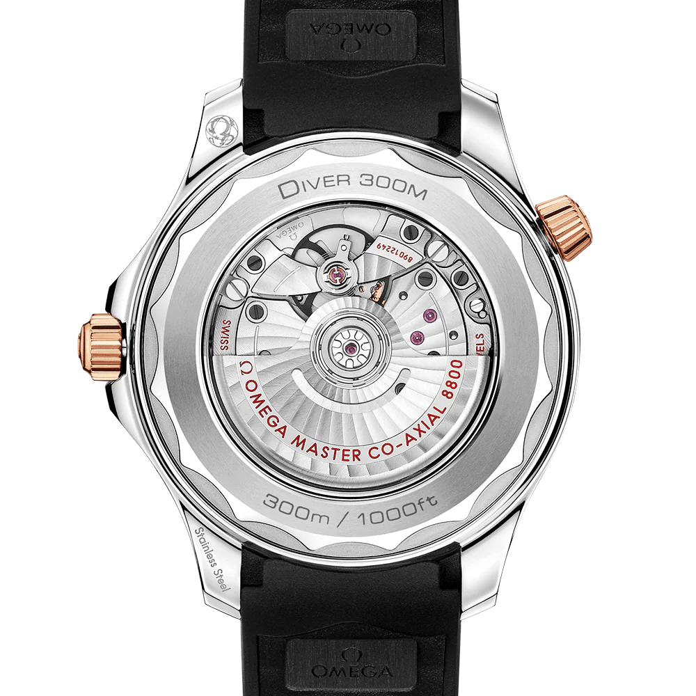 Seamaster Diver 300M watches from Omega are equipped with everything needed for deep and daring underwater exploration. The watch Features qualities like a screw-down crown, screw-down caseback, a rugged 300-meter water resistant stainless steel and 18ct Sedna Gold case and a helium escape valve. To assist with a clear view into its black wave-effect dial, the Omega Seamaster Diver 300M watch is fitted with an anti glare sapphire crystal glass front. The back of the case also Features an exhibition glass crafted from the same material, putting an in-house made movement on show. The men’s Omega Seamaster watch measures a 43mm diameter and comes equipped with a supple black rubber strap with a folding clasp. The laser-engraved waves on the dial are home to Super-LumiNova coated hands and hour indexes, as well as a date aperture at 3 o’clock. The fine 18ct Sedna Gold finishes add a luxurious twist to the design. To power the hands around this legible display, the Omega Seamaster Diver 300M watch is equipped with the Omega Master Chronometer Calibre 8800, which provides an impressive 55-hour power reserve and promises a magnetic resistance of up to 15,000 gauss.